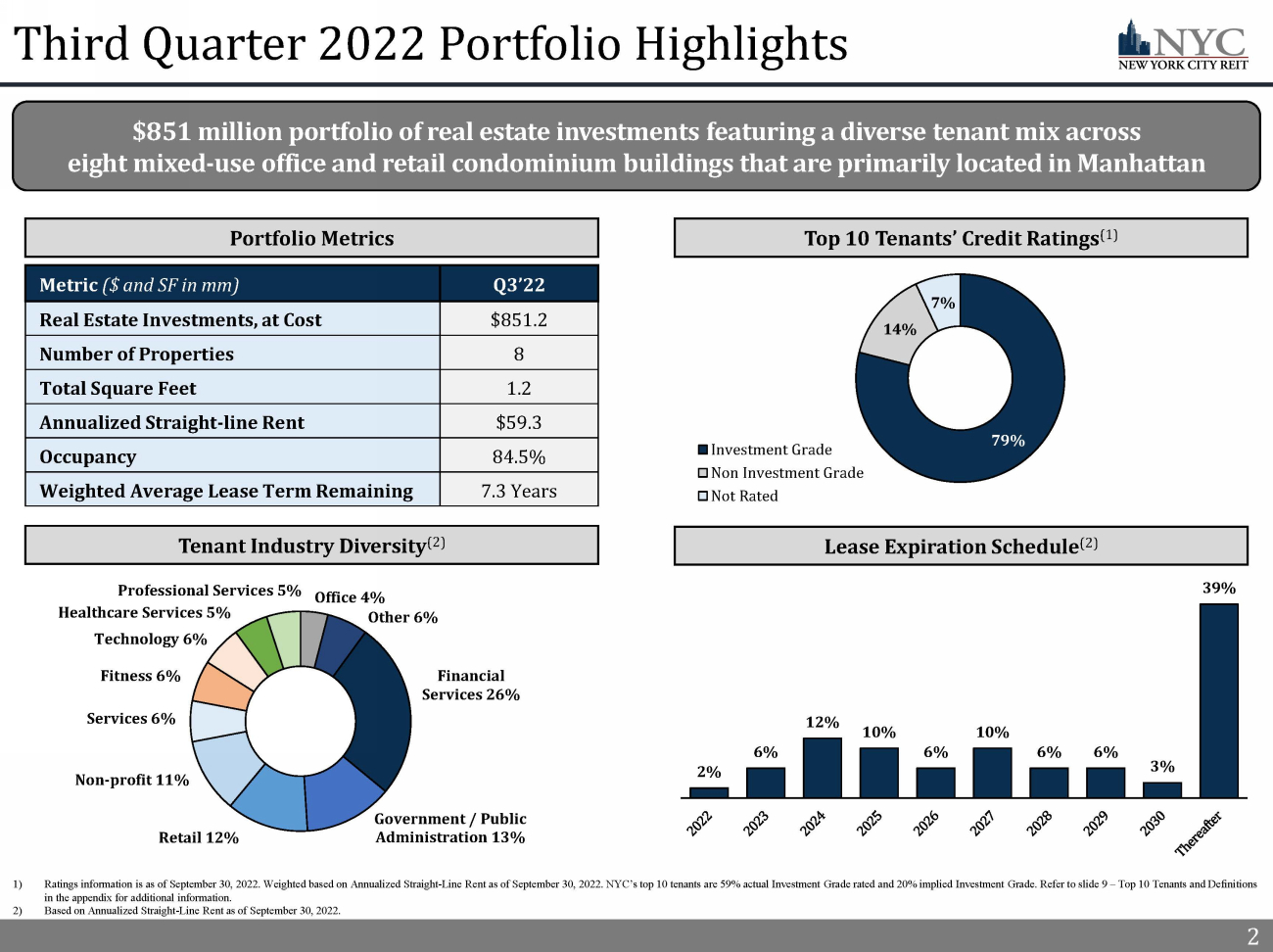 1 Third Quarter 2022 Highlights 1) See appendix for a full description of capitalized terms and Non - GAAP reconciliations. 2) Refer to slide 9 – Top 10 Tenant Investment Grade Profile. 3) Refer to slide 10 – Proactive Asset Management for additional information. 4) Refer to slide 3 – Continued Original Cash Rent Collection Success for additional information. Total rent collected during the p eriod includes both Original Cash Rent due and payments made by tenants pursuant to rent deferral agreements. 5) Refer to slide 13 – Capital Structure and Q3’22 Financial Results for further information regarding our capital structure and liquidity. 1 NYC is a real estate investment trust with a high - quality real estate portfolio focused on the Manhattan market and tenants with core commercial businesses. NYC features a portfolio with near complete portfolio Original Cash Rent (1) collection, an attractive top 10 tenant base that is 79% Investment Grade (1) rated and a strong leasing platform with demonstrated success x Portfolio Occupancy (1) of 85% with a weighted average Remaining Lease Term (1) of 7.3 years x Resilient tenant base featuring government agencies and Investment Grade corporate tenants with core commercial business x Top 10 tenants (2) that are 79% Investment Grade rated and have a Remaining Lease Term of 9.9 years x Well balanced and long - term lease maturity schedule with 39% of leases expiring after 2030 x Since Knotel’s termination, NYC replaced 82% of the square footage (“SF”) and 74% of the Annualized Straight - line Rent (“SLR”) (1) formerly derived from Knotel x Year to date, NYC completed seven new leases, increasing portfolio Occupancy by 2%, including an 8% increase at 9 Times Square x Year over year, office usage at NYC’s three office properties increased by 19% on average as companies adopt mandatory in - office policies x 100% fixed debt capital structure with a weighted average debt maturity of 4.4 years at a 4.4% weighted average interest rate x Year over year, total portfolio Original Cash Rent (1) collection improved from 92% to 99% (4) and complete collection among NYC’s top 10 tenants in Q3’22 x As of November 1st, 2022, NYC’s independent board members owned 83,000 shares of NYC and separately, NYC’s Advisor and its affiliates owned nearly 3.0 million shares of NYC, demonstrating their depth of commitment by increasing ownership in NYC High Quality Manhattan Focused Portfolio Continued Leasing Momentum and Knotel Replacement (3) Conservative Debt Profile and Board and Advisor Shareholder Alignment (4)(5)