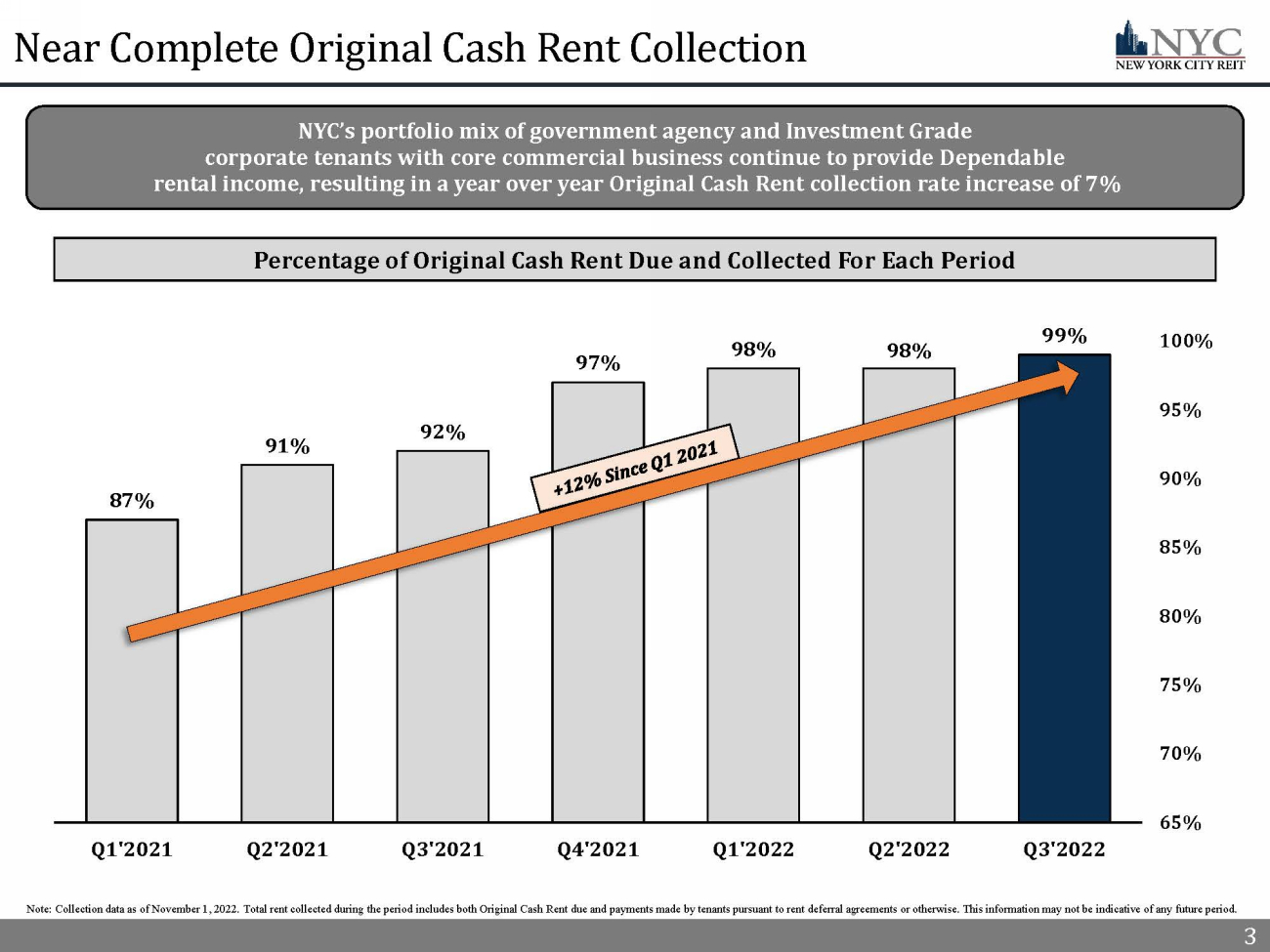 2 Third Quarter 2022 Portfolio Highlights Metric ($ and SF in mm) Q3’22 Real Estate Investments, at Cost $851.2 Number of Properties 8 Total Square Feet 1.2 Annualized Straight - line Rent $59.3 Occupancy 84.5% Weighted Average Lease Term Remaining 7.3 Years 1) Ratings information is as of September 30, 2022. Weighted based on Annualized Straight - Line Rent as of September 30, 2022. NYC’s top 10 tenants are 59% actual Investment Grade rated and 20% implied Investment Grade. Refer to slide 9 – Top 10 Tenants and Definitions in the appendix for additional information. 2) Based on Annualized Straight - Line Rent as of September 30 , 2022. 2 2% 6% 12% 10% 6% 10% 6% 6% 3% 39% Financial Services 26% Government / Public Administration 13% Retail 12% Non - profit 11% Services 6% Fitness 6% Technology 6% Healthcare Services 5% Professional Services 5% Office 4% Other 6% $851 million portfolio of real estate investments featuring a diverse tenant mix across eight mixed - use office and retail condominium buildings that are primarily located in Manhattan Top 10 Tenants’ Credit Ratings (1) Tenant Industry Diversity (2) Lease Expiration Schedule (2) Portfolio Metrics 79% 14% 7% Investment Grade Non Investment Grade Not Rated