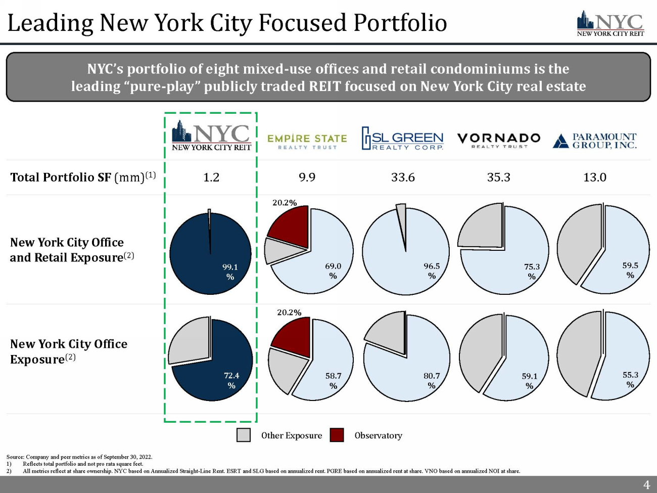 3 Near Complete Original Cash Rent Collection 3 Percentage of Original Cash Rent Due and Collected For Each Period Note: Collection data as of November 1, 2022. Total rent collected during the period includes both Original Cash Rent due and pa yments made by tenants pursuant to rent deferral agreements or otherwise. This information may not be indicative of any futur e p eriod. 99% 98% 98% 97% 92% 91% 87% 65% 70% 75% 80% 85% 90% 95% 100% Q3'2022 Q2'2022 Q1'2022 Q4'2021 Q3'2021 Q2'2021 Q1'2021 NYC’s portfolio mix of government agency and Investment Grade corporate tenants with core commercial business continue to provide Dependable rental income, resulting in a y ear over year Original Cash Rent collection rate increase of 7%