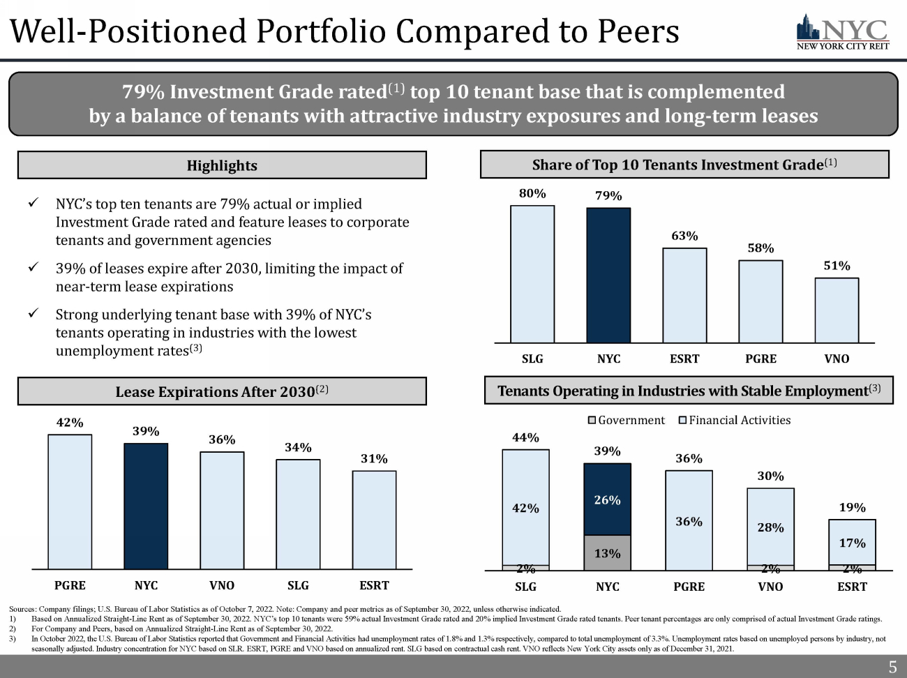 4 Leading New York City Focused Portfolio NYC’s portfolio of eight mixed - use offices and retail condominiums is the leading “pure - play” publicly traded REIT focused on New York City real estate Total Portfolio SF (mm) (1) 4 New York City Office and Retail Exposure (2) New York City Office Exposure (2) Other Exposure Observatory Source: Company and peer metrics as of September 30, 2022 . 1) Reflects total portfolio and not pro rata square feet. 2) All metrics reflect at share ownership. NYC based on Annualized Straight - Line Rent. ESRT and SLG based on annualized rent. PGRE based on annualized rent at share. VNO based on annualized NOI at share. 1.2 9.9 33.6 35.3 13.0 72.4 % 80.7 % 59.1 % 55.3 % 69.0 % 96.5 % 75.3 % 59.5 % 20.2% 58.7 % 20.2% 99.1 %