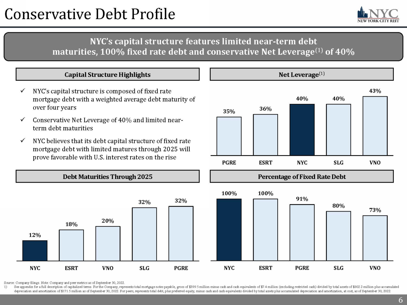 5 Well - Positioned Portfolio Compared to Peers 5 Sources: Company filings; U.S. Bureau of Labor Statistics as of October 7, 2022. Note: Company and peer metrics as of Septemb er 30, 2022, unless otherwise indicated. 1) Based on Annualized Straight - Line Rent as of September 30, 2022. NYC’s top 10 tenants were 59% actual Investment Grade rated and 20% implied Investment Grade rated tenants. Peer tenant percentages are only comprised of actual Investment Grade ratings. 2) For Company and Peers, based on Annualized Straight - Line Rent as of September 30, 2022. 3) In October 2022, the U.S. Bureau of Labor Statistics reported that Government and Financial Activities had unemployment rates of 1.8% and 1.3% respectively, compared to total unemployment of 3.3%. Unemployment rates based on unemployed persons by industr y, not seasonally adjusted. Industry concentration for NYC based on SLR. ESRT, PGRE and VNO based on annualized rent. SLG based on c ont ractual cash rent. VNO reflects New York City assets only as of December 31, 2021. Tenants Operating in Industries with Stable Employment (3) Share of Top 10 Tenants Investment Grade (1) Lease Expirations After 2030 (2) Highlights 79% Investment Grade rated (1) top 10 tenant base that is complemented by a balance of tenants with attractive industry exposures and long - term leases 42% 39% 36% 34% 31% PGRE NYC VNO SLG ESRT x NYC’s top ten tenants are 79% actual or implied Investment Grade rated and feature leases to corporate tenants and government agencies x 39% of leases expire after 2030, limiting the impact of near - term lease expirations x Strong underlying tenant base with 39% of NYC’s tenants operating in industries with the lowest unemployment rates (3) 2% 13% 2% 2% 42% 26% 36% 28% 17% 44% 39% 36% 30% 19% SLG NYC PGRE VNO ESRT Government Financial Activities 80% 79% 63% 58% 51% SLG NYC ESRT PGRE VNO