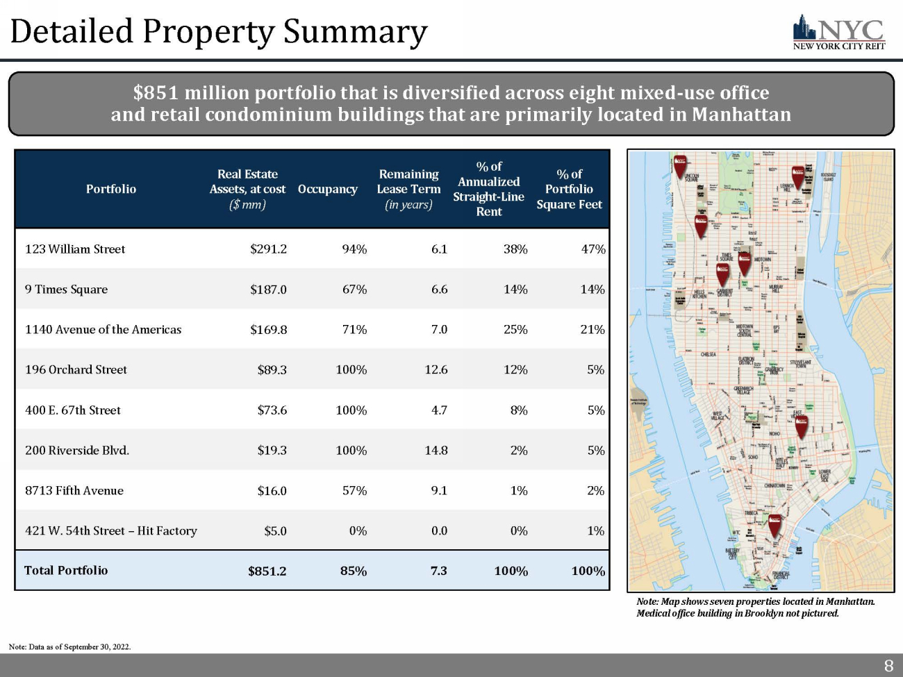 8 8 Detailed Property Summary Note: Data as of September 30, 2022. Portfolio Real Estate Assets, at cost ($ mm) Occupancy Remaining Lease Term (in years) % of Annualized Straight - Line Rent % of Portfolio Square Feet 123 William Street $291.2 94% 6.1 38% 47% _ 9 Times Square $187.0 67% 6.6 14% 14% _ 1140 Avenue of the Americas $169.8 71% 7.0 25% 21% _ 196 Orchard Street $89.3 100% 12.6 12% 5% _ 400 E. 67th Street $73.6 100% 4.7 8% 5% _ 200 Riverside Blvd. $19.3 100% 14.8 2% 5% _ 8713 Fifth Avenue $16.0 57% 9.1 1% 2% _ 421 W. 54th Street – Hit Factory $5.0 0% 0.0 0% 1% _ Total Portfolio $851.2 85% 7.3 100% 100% _ Note: Map shows seven properties located in Manhattan. Medical office building in Brooklyn not pictured. $851 million portfolio that is diversified across eight mixed - use office and retail condominium buildings that are primarily located in Manhattan