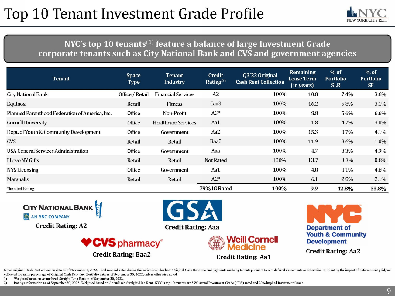9 9 Note: Original Cash Rent collection data as of November 1, 2022. Total rent collected during the period includes both Origina l C ash Rent due and payments made by tenants pursuant to rent deferral agreements or otherwise. Eliminating the impact of deferr ed rent paid, we collected the same percentage of Original Cash Rent due. Portfolio data as of September 30, 2022, unless otherwise noted. 1) Weighted based on Annualized Straight - Line Rent as of September 30, 2022. 2) Ratings information as of September 30, 2022. Weighted based on Annualized Straight - Line Rent. NYC’s top 10 tenants are 59% actu al Investment Grade (“IG”) rated and 20% implied Investment Grade. Top 10 Tenant Investment Grade Profile Tenant Space Type Tenant Industry Credit Rating (2) Q3’22 Original Cash Rent Collection Remaining Lease Term (in years) % of Portfolio SLR % of Portfolio SF City National Bank Office / Retail Financial Services A2 100% 10.8 7.4% 3.6% _ Equinox Retail Fitness Caa3 100% 16.2 5.8% 3.1% _ Planned Parenthood Federation of America, Inc. Office Non - Profit A3* 100% 8.8 5.6% 6.6% _ Cornell University Office Healthcare Services Aa1 100% 1.8 4.2% 3.0% _ Dept. of Youth & Community Development Office Government Aa2 100% 15.3 3.7% 4.1% _ CVS Retail Retail Baa2 100% 11.9 3.6% 1.0% _ USA General Services Administration Office Government Aaa 100% 4.7 3.3% 4.9% _ I Love NY Gifts Retail Retail Not Rated 100% 13.7 3.3% 0.8% _ NYS Licensing Office Government Aa1 100% 4.8 3.1% 4.6% _ Marshalls Retail Retail A2* 100% 6.1 2.8% 2.1% _ *Implied Rating 79% IG Rated 100% 9.9 42.8% 33.8% _ Credit Rating: A2 Credit Rating: Aa1 Credit Rating: Baa2 Credit Rating: Aaa Credit Rating: Aa2 NYC’s top 10 tenants (1) feature a balance of large Investment Grade corporate tenants such as City National Bank and CVS and government agencies