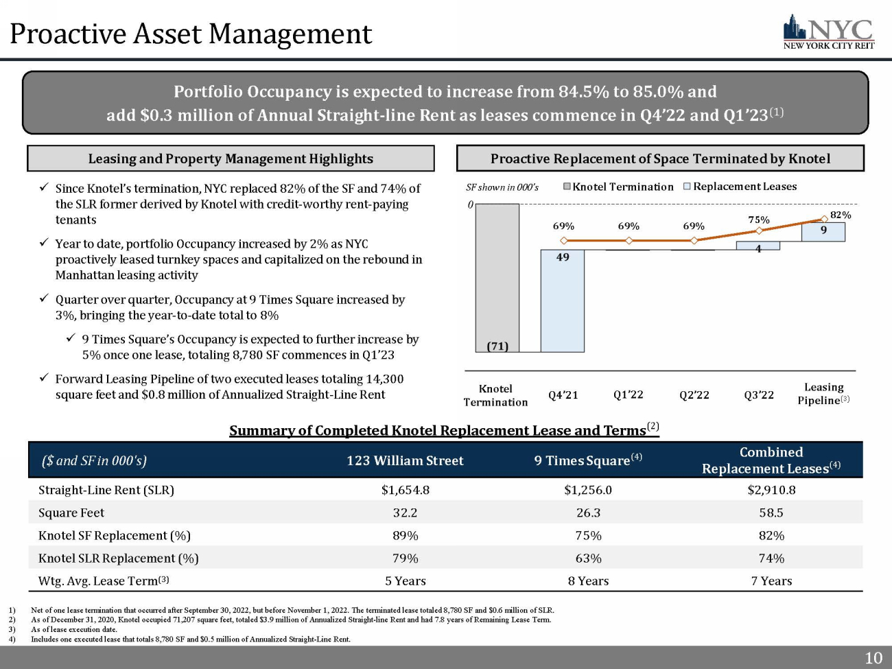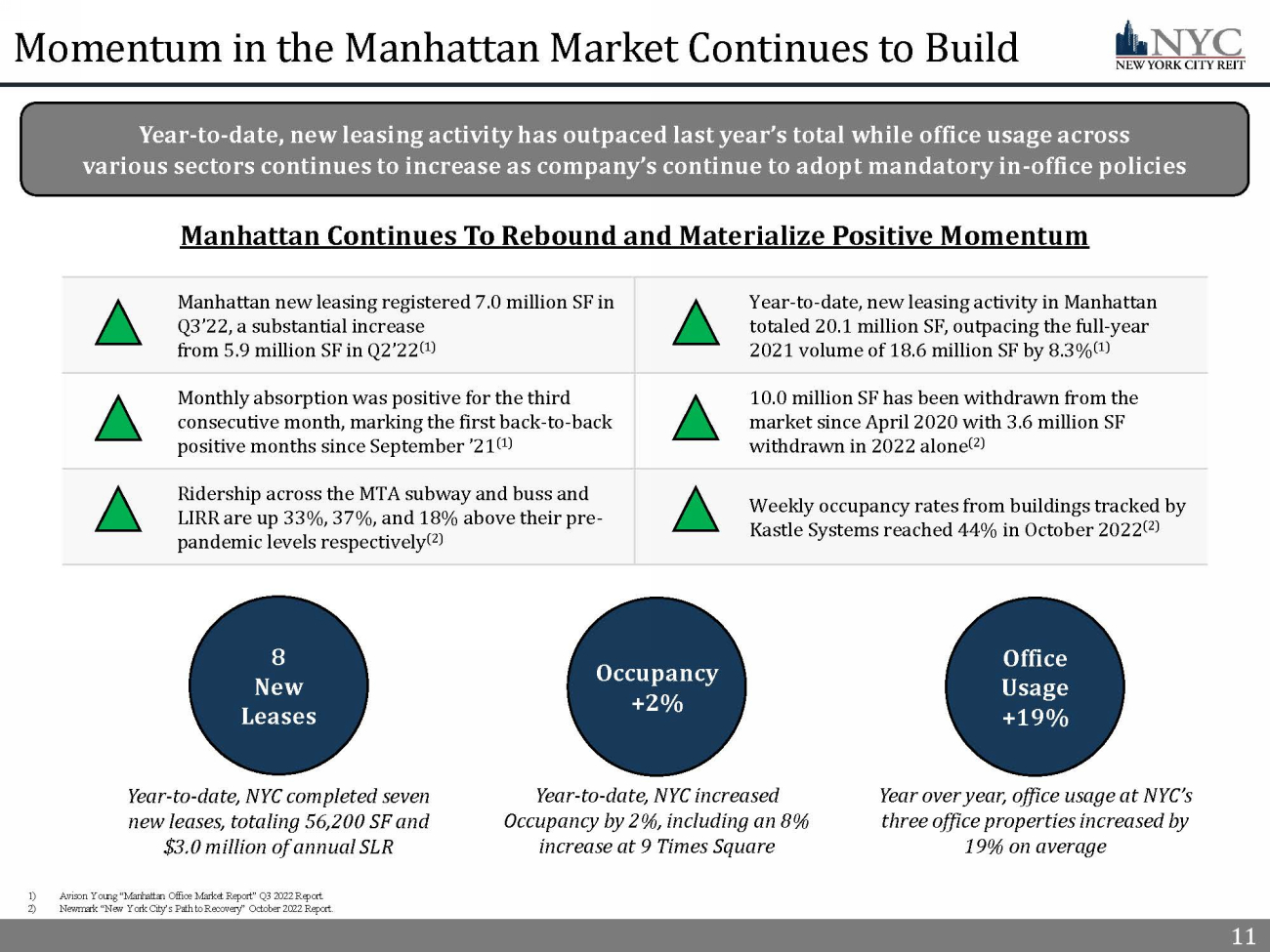 10 10 69% 69% 69% 75% 82% Portfolio Occupancy is expected to increase from 84.5% to 85.0% and add $0.3 million of Annual Straight - line Rent as leases commence in Q4’22 and Q1’23 (1) Proactive Asset Management 10 Summary of Completed Knotel Replacement Lease and Terms (2) Proactive Replacement of Space Terminated by Knotel Leasing and Property Management Highlights x Since Knotel’s termination, NYC replaced 82% of the SF and 74% of the SLR former derived by Knotel with credit - worthy rent - paying tenants x Year to date, portfolio Occupancy increased by 2% as NYC proactively leased turnkey spaces and capitalized on the rebound in Manhattan leasing activity x Quarter over quarter, Occupancy at 9 Times Square increased by 3%, bringing the year - to - date total to 8% x 9 Times Square’s Occupancy is expected to further increase by 5% once one lease, totaling 8,780 SF commences in Q1’23 x Forward Leasing Pipeline of two executed leases totaling 14,300 square feet and $0.8 million of Annualized Straight - Line Rent 1) Net of one lease termination that occurred after September 30, 2022, but before November 1, 2022. The terminated lease totale d 8 ,780 SF and $0.6 million of SLR. 2) As of December 31, 2020, Knotel occupied 71 ,207 square feet, totaled $3.9 million of Annualized Straight - line Rent and had 7.8 years of Remaining Lease Term. 3) As of lease execution date. 4) Includes one executed lease that totals 8,780 SF and $0.5 million of Annualized Straight - Line Rent. ($ and SF in 000's) 123 William Street 9 Times Square (4) Combined Replacement Leases (4) Straight - Line Rent (SLR) $1,654.8 $1,256.0 $2,910.8 Square Feet 32.2 26.3 58.5 Knotel SF Replacement (%) 89% 75% 82% Knotel SLR Replacement (%) 79% 63% 74% Wtg . Avg. Lease Term (3) 5 Years 8 Years 7 Years Knotel Termination Replacement Leases 0 SF shown in 000’s Knotel Termination Leasing Pipeline (3) Q4’21 Q1’22 Q2’22 Q3’22