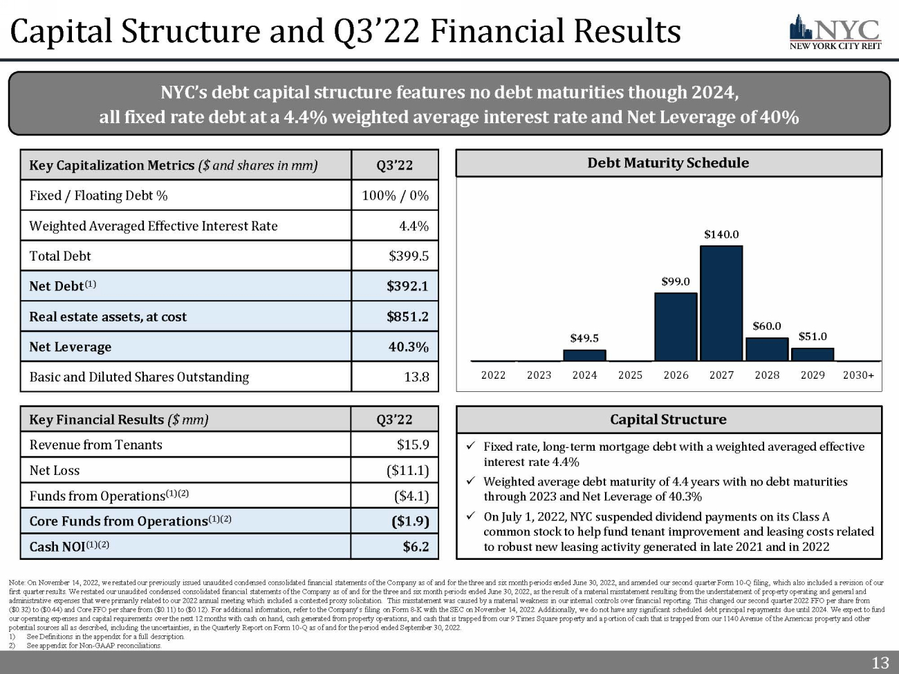 13 13 Capital Structure and Q3’22 Financial Results Note: On November 14, 2022, we restated our previously issued unaudited condensed consolidated financial statements of the Co mpa ny as of and for the three and six month periods ended June 30, 2022, and amended our second quarter Form 10 - Q filing, which als o included a revision of our first quarter results. We restated our unaudited condensed consolidated financial statements of the Company as of and for the th ree and six month periods ended June 30, 2022, as the result of a material misstatement resulting from the understatement of pro perty operating and general and administrative expenses that were primarily related to our 2022 annual meeting which included a contested proxy solicitation. T his misstatement was caused by a material weakness in our internal controls over financial reporting. This changed our second qu arter 2022 FFO per share from ($0.32) to ($0.44) and Core FFO per share from ($0.11) to ($0.12). For additional information, refer to the Company’s filing on Form 8 - K with the SEC on November 14, 2022. Additionally, we do not have any significant scheduled debt principal repayments due until 2024. We expect to fund our operating expenses and capital requirements over the next 12 months with cash on hand, cash generated from property opera tio ns, and cash that is trapped from our 9 Times Square property and a portion of cash that is trapped from our 1140 Avenue of t he Americas property and other potential sources all as described, including the uncertainties, in the Quarterly Report on Form 10 - Q as of and for the period e nded September 30, 2022. 1) See Definitions in the appendix for a full description. 2) See appendix for Non - GAAP reconciliations. NYC’s debt capital structure features no debt maturities though 2024, all fixed rate debt at a 4.4% weighted average interest rate and Net Leverage of 40% Key Capitalization Metrics ($ and shares in mm) Q3’22 Fixed / Floating Debt % 100% / 0% Weighted Averaged Effective Interest Rate 4.4% Total Debt $399.5 Net Debt (1) $392.1 Real estate assets, at cost $851.2 Net Leverage 40.3% Basic and Diluted Shares Outstanding 13.8 Debt Maturity Schedule $49.5 $99.0 $140.0 $60.0 $51.0 $40.0 $60.0 $80.0 $100.0 $120.0 $140.0 $160.0 $180.0 2022 2023 2024 2025 2026 2027 2028 2029 2030+ Key Financial Results ($ mm) Q3’22 Revenue from Tenants $15.9 Net Loss ($11.1) Funds from Operations (1)(2) ($4.1) Core Funds from Operations (1)(2) ($1.9) Cash NOI (1)(2) $6.2 Capital Structure x Fixed rate, long - term mortgage debt with a weighted averaged effective interest rate 4.4% x Weighted average debt maturity of 4.4 years with no debt maturities through 2023 and Net Leverage of 40.3% x On July 1, 2022, NYC suspended dividend payments on its Class A common stock to help fund tenant improvement and leasing costs related to robust new leasing activity generated in late 2021 and in 2022