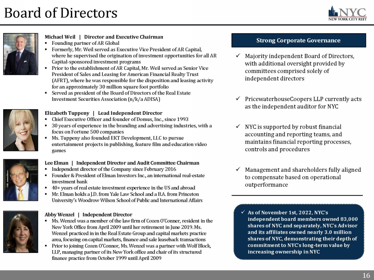 15 15 Experienced Management Team Michael Weil Chief Executive Officer, President and Chairman of the Board of Directors ▪ Founding partner of AR Global ▪ Formerly, Mr. Weil served as Executive Vice President of AR Capital, where he supervised the origination of investment opport uni ties for all AR Capital - sponsored investment programs ▪ Served as president of the Board of Directors of the Real Estate Investment Securities Association (n/k/a ADISA) Chris Masterson Chief Financial Officer and Treasurer ▪ Elected Chief Financial Officer and Treasurer of New York City REIT in September 2019 ▪ Currently serves as Chief Financial Officer of Global Net Lease, Inc. (NYSE: GNL) ▪ Past experience includes accounting positions with Goldman Sachs and KPMG Jason Slear Executive Vice President of Real Estate Acquisitions and Dispositions ▪ Responsible for sourcing, negotiating and closing AR Global’s real estate acquisitions and dispositions ▪ Oversaw the acquisition of over $3.5 billion of real estate assets and the lease - up of over 10 million square feet during profes sional career Boris Korotkin Senior Vice President of Capital Markets ▪ Responsible for leading all debt capital market transactions ▪ Former Executive Vice President of Transaction Structuring for American Financial Realty Trust Ori Kravel Senior Vice President of Corporate Development ▪ Responsible for corporate development and business strategy ▪ Executed over $12 billion of capital market transactions and over $25 billion of M&A transactions Christopher Chao Senior Vice President of Asset Management ▪ Responsible for asset management and leasing activity ▪ Former asset management and acquisitions director for Paramount Group, Inc., a 9 million square foot New York City office por tfo lio