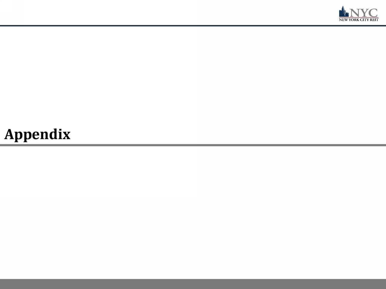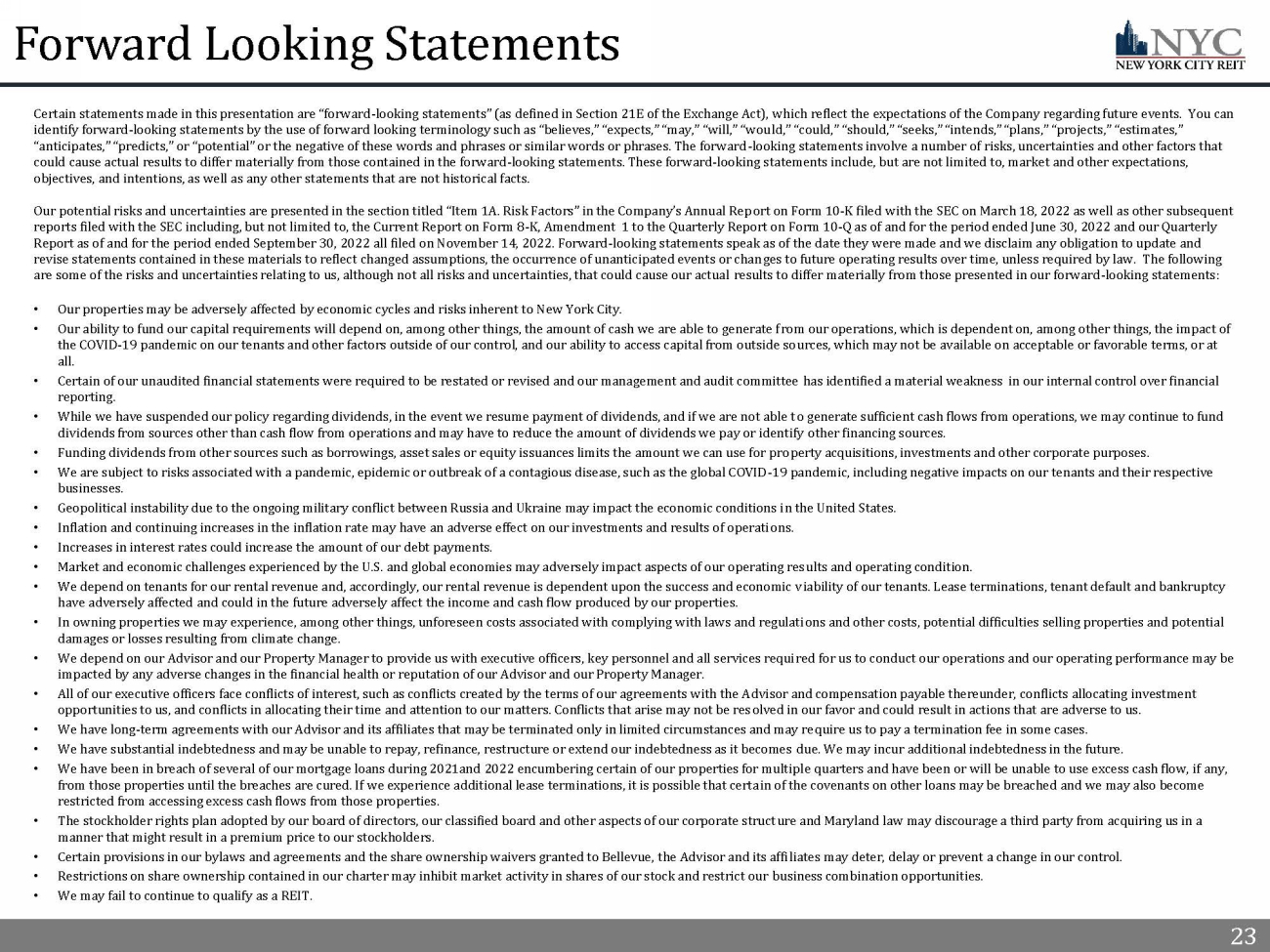 22 22 Important Additional Information and Where to Find It References in this presentation to the “Company,” “we,” “us” and “our” refer to New York City REIT, Inc. (“NYC”) and its cons oli dated subsidiaries. This presentation contains estimates and information concerning the Company’s industry and the Company’s peer companies that are based on industry publications, reports and peer company public filings. The Company has not independently verified the accuracy of the data co nta ined in these industry publications, reports and peer company public filings. These estimates and information involve a number of assumptions and li mit ations, and you are cautioned not to rely on or give undue weight to this information. The industry in which we operate is subject to a high deg ree of uncertainty and risk due to variety of factors, including those described in the “Risk Factors” and “Management's Discussion and Analysis of Financial Co ndi tion and Results of Operations” sections of the Company’s Annual Report on Form 10 - K filed with the SEC on March 18, 2022 and all other filings file d with the SEC after that date. These and other factors could cause results to differ materially from those expressed in these publications and reports . The majority of the concessions granted to our tenants as a result of the COVID - 19 pandemic are rent deferrals or temporary rent abatements with the original lease term unchanged and collection of deferred rent deemed probable. As a result of relief granted by the FASB and the SEC related to lease modification accounting, rental revenue used to calculate Net Income, NAREIT FFO, Core FFO, NOI, Cash NOI, EBITDA, and Adjust ed EBITDA has not been, and we do not expect it to be, significantly impacted by these types of deferrals. 22