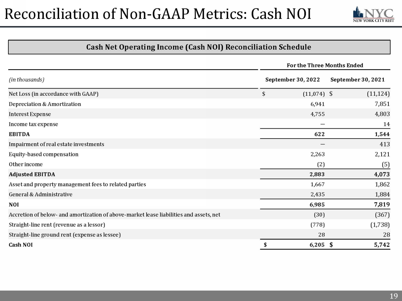 19 19 Reconciliation of Non - GAAP Metrics: Cash NOI For the Three Months Ended (in thousands) September 30, 2022 September 30, 2021 Net Loss (in accordance with GAAP) $ (11,074) $ (11,124) Depreciation & Amortization 6,941 7,851 Interest Expense 4,755 4,803 Income tax expense ─ 14 EBITDA 622 1,544 Impairment of real estate investments ─ 413 Equity - based compensation 2,263 2,121 Other income (2) (5) Adjusted EBITDA 2,883 4,073 Asset and property management fees to related parties 1,667 1,862 General & Administrative 2,435 1,884 NOI 6,985 7,819 Accretion of below - and amortization of above - market lease liabilities and assets, net (30) (367) Straight - line rent (revenue as a lessor) (778) (1,738) Straight - line ground rent (expense as lessee) 28 28 Cash NOI $ 6,205 $ 5,742 Cash Net Operating Income (Cash NOI) Reconciliation Schedule