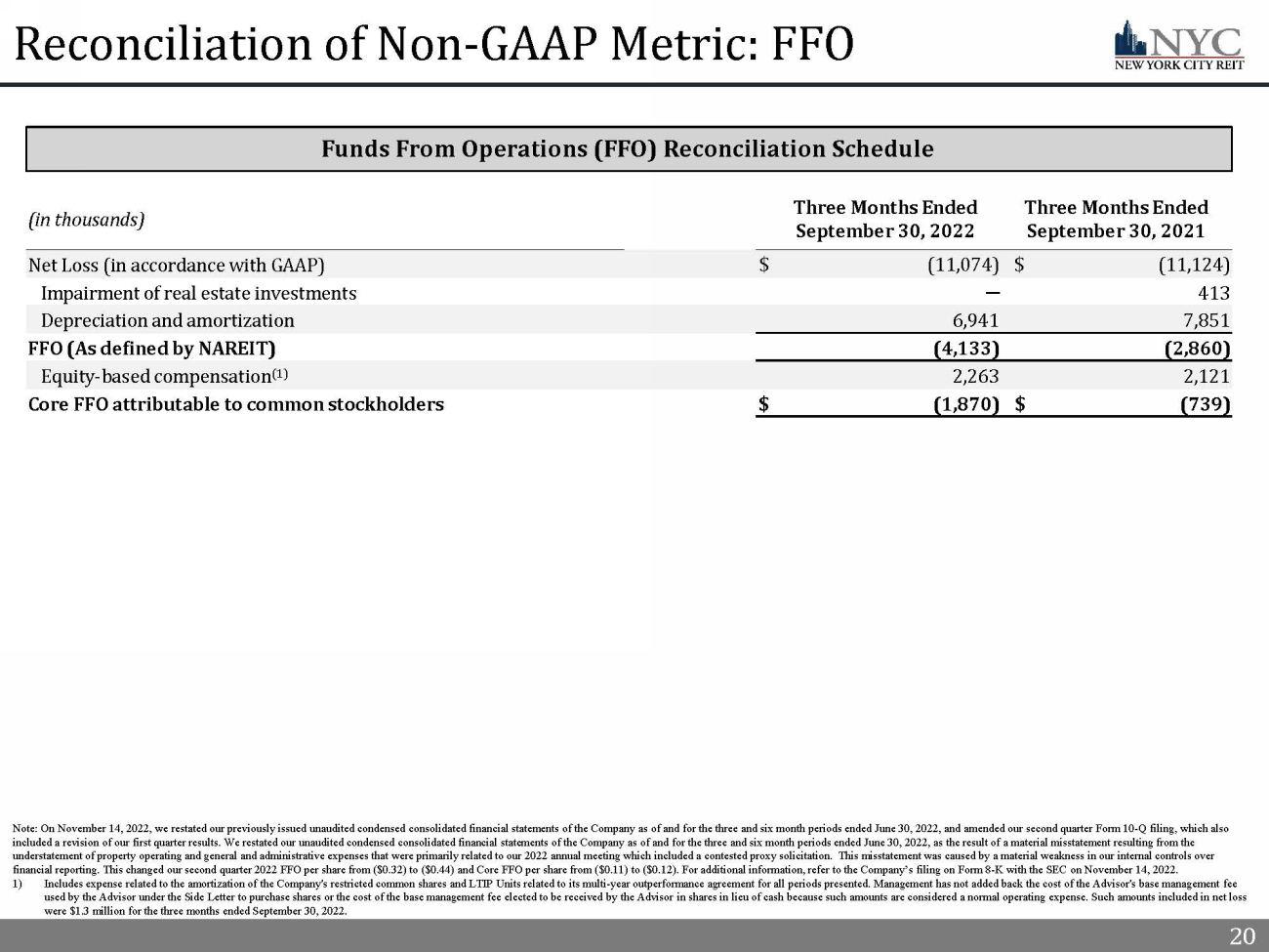 20 20 Reconciliation of Non - GAAP Metric: FFO (in thousands) Three Months Ended September 30, 2022 Three Months Ended September 30, 2021 Net Loss (in accordance with GAAP) $ (11,074) $ (11,124) Impairment of real estate investments ─ 413 Depreciation and amortization 6,941 7,851 FFO (As defined by NAREIT) (4,133) (2,860) Equity - based compensation (1) 2,263 2,121 Core FFO attributable to common stockholders $ (1,870) $ (739) Funds From Operations (FFO) Reconciliation Schedule Note: On November 14, 2022, we restated our previously issued unaudited condensed consolidated financial statements of the Co mpa ny as of and for the three and six month periods ended June 30, 2022, and amended our second quarter Form 10 - Q filing, which als o included a revision of our first quarter results. We restated our unaudited condensed consolidated financial statements of th e C ompany as of and for the three and six month periods ended June 30, 2022, as the result of a material misstatement resulting fro m the understatement of property operating and general and administrative expenses that were primarily related to our 2022 annual m eet ing which included a contested proxy solicitation. This misstatement was caused by a material weakness in our internal contr ols over financial reporting. This changed our second quarter 2022 FFO per share from ($0.32) to ($0.44) and Core FFO per share from ( $0. 11) to ($0.12). For additional information, refer to the Company’s filing on Form 8 - K with the SEC on November 14, 2022. 1) Includes expense related to the amortization of the Company's restricted common shares and LTIP Units related to its multi - year outperformance agreement for all periods presented. Management has not added back the cost of the Advisor's base management f ee used by the Advisor under the Side Letter to purchase shares or the cost of the base management fee elected to be received by the Advisor in shares in lieu of cash because such amounts are considered a normal operating expens e. Such amounts included in net loss were $1.3 million for the three months ended September 30, 2022.