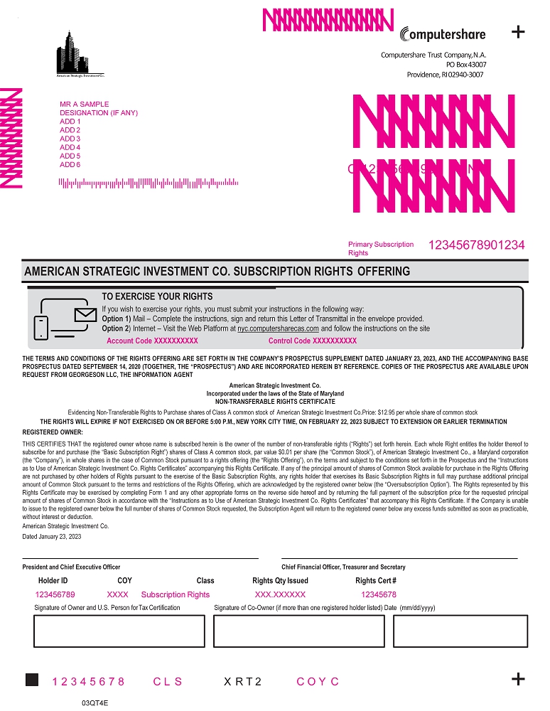 NNNNNNNNN NNNNNN NNNNNN NNNNNNNNNNNN 1 2 3 4 5 6 7 8 03QT4E Rights Cert # 12345678 Rights Qty Issued XXX.XXXXXX Holder ID 123456789 COY Class XXXX Subscription Rights 12345678901234 Primary Subscription Rights MR A SAMPLE DESIGNATION (IF ANY) ADD 1 ADD 2 ADD 3 ADD 4 ADD 5 ADD 6 C 1234567890 J N T C O Y C C L S . + Signature of Owner and U.S. Person for Tax Certification Signature of Co - Owner (if more than one registered holder listed) Date (mm/dd/yyyy) + X R T 2 President and Chief Executive Officer Chief Financial Officer, Treasurer and Secretary Computershare Trust Company, N.A. PO Box 43007 Providence, RI 02940 - 3007 AMERICAN STRATEGIC INVESTMENT CO. SUBSCRIPTION RIGHTS OFFERING TO EXERCISE YOUR RIGHTS If you wish to exercise your rights, you must submit your instructions in the following way: Option 1) Mail – Complete the instructions, sign and return this Letter of Transmittal in the envelope provided. Option 2 ) Internet – Visit the Web Platform at nyc.computersharecas.com and follow the instructions on the site Account Code XXXXXXXXXX Control Code XXXXXXXXXX THE TERMS AND CONDITIONS OF THE RIGHTS OFFERING ARE SET FORTH IN THE COMPANY’S PROSPECTUS SUPPLEMENT DATED JANUARY 23 , 2023 , AND THE ACCOMPANYING BASE PROSPECTUS DATED SEPTEMBER 14 , 2020 (TOGETHER, THE “PROSPECTUS”) AND ARE INCORPORATED HEREIN BY REFERENCE . COPIES OF THE PROSPECTUS ARE AVAILABLE UPON REQUEST FROM GEORGESON LLC, THE INFORMATION AGENT American Strategic Investment Co. Incorporated under the laws of the State of Maryland NON - TRANSFERABLE RIGHTS CERTIFICATE Evidencing Non - Transferable Rights to Purchase shares of Class A common stock of American Strategic Investment Co.Price: $12.95 per whole share of common stock THE RIGHTS WILL EXPIRE IF NOT EXERCISED ON OR BEFORE 5:00 P.M., NEW YORK CITY TIME, ON FEBRUARY 22, 2023 SUBJECT TO EXTENSION OR EARLIER TERMINATION REGISTERED OWNER: THIS CERTIFIES THAT the registered owner whose name is subscribed herein is the owner of the number of non - transferable rights (“Rights”) set forth herein . Each whole Right entitles the holder thereof to subscribe for and purchase (the “Basic Subscription Right”) shares of Class A common stock, par value $ 0 . 01 per share (the “Common Stock”), of American Strategic Investment Co . , a Maryland corporation (the “Company”), in whole shares in the case of Common Stock pursuant to a rights offering (the “Rights Offering”), on the terms and subject to the conditions set forth in the Prospectus and the “Instructions as to Use of American Strategic Investment Co . Rights Certificates” accompanying this Rights Certificate . If any of the principal amount of shares of Common Stock available for purchase in the Rights Offering are not purchased by other holders of Rights pursuant to the exercise of the Basic Subscription Rights, any rights holder that exercises its Basic Subscription Rights in full may purchase additional principal amount of Common Stock pursuant to the terms and restrictions of the Rights Offering, which are acknowledged by the registered owner below (the “Oversubscription Option”) . The Rights represented by this Rights Certificate may be exercised by completing Form 1 and any other appropriate forms on the reverse side hereof and by returning the full payment of the subscription price for the requested principal amount of shares of Common Stock in accordance with the “Instructions as to Use of American Strategic Investment Co . Rights Certificates” that accompany this Rights Certificate . If the Company is unable to issue to the registered owner below the full number of shares of Common Stock requested, the Subscription Agent will return to the registered owner below any excess funds submitted as soon as practicable, without interest or deduction . American Strategic Investment Co . Dated January 23 , 2023