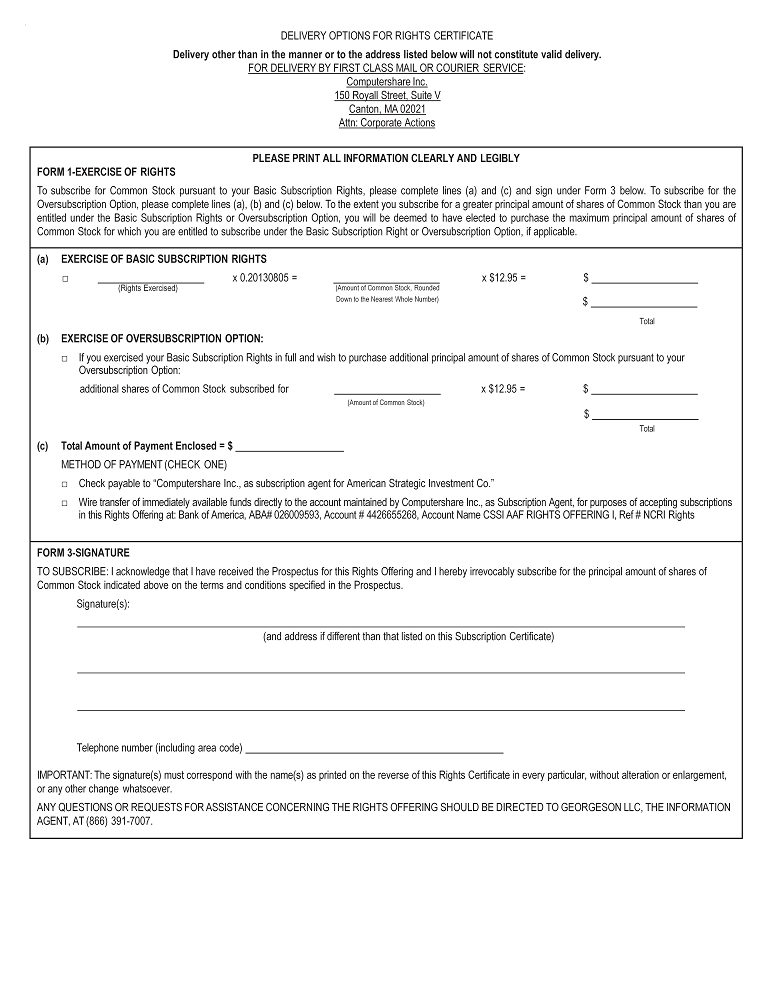 . DELIVERY OPTIONS FOR RIGHTS CERTIFICATE Delivery other than in the manner or to the address listed below will not constitute valid delivery. FOR DELIVERY BY FIRST CLASS MAIL OR COURIER SERVICE : Computershare Inc. 150 Royall Street, Suite V Canton, MA 02021 Attn: Corporate Actions PLEASE PRINT ALL INFORMATION CLEARLY AND LEGIBLY FORM 1 - EXERCISE OF RIGHTS To subscribe for Common Stock pursuant to your Basic Subscription Rights, please complete lines (a) and (c) and sign under Form 3 below . To subscribe for the Oversubscription Option, please complete lines (a), (b) and (c) below . To the extent you subscribe for a greater principal amount of shares of Common Stock than you are entitled under the Basic Subscription Rights or Oversubscription Option, you will be deemed to have elected to purchase the maximum principal amount of shares of Common Stock for which you are entitled to subscribe under the Basic Subscription Right or Oversubscription Option, if applicable . (a) EXERCISE OF BASIC SUBSCRIPTION RIGHTS Ƒ x 0.20130805 = x $12.95 = $ (Rights Exercised) (Amount of Common Stock, Rounded Down to the Nearest Whole Number) $ Total (b) EXERCISE OF OVERSUBSCRIPTION OPTION: □ If you exercised your Basic Subscription Rights in full and wish to purchase additional principal amount of shares of Common Stock pursuant to your Oversubscription Option: additional shares of Common Stock subscribed for x $12.95 = $ (Amount of Common Stock) $ Total (c) Total Amount of Payment Enclosed = $ METHOD OF PAYMENT (CHECK ONE) □ Check payable to “Computershare Inc., as subscription agent for American Strategic Investment Co.” □ Wire transfer of immediately available funds directly to the account maintained by Computershare Inc., as Subscription Agent, for purposes of accepting subscriptions in this Rights Offering at: Bank of America, ABA# 026009593, Account # 4426655268, Account Name CSSI AAF RIGHTS OFFERING I, Ref # NCRI Rights FORM 3 - SIGNATURE TO SUBSCRIBE: I acknowledge that I have received the Prospectus for this Rights Offering and I hereby irrevocably subscribe for the principal amount of shares of Common Stock indicated above on the terms and conditions specified in the Prospectus. Signature(s): (and address if different than that listed on this Subscription Certificate) Telephone number (including area code) IMPORTANT: The signature(s) must correspond with the name(s) as printed on the reverse of this Rights Certificate in every particular, without alteration or enlargement, or any other change whatsoever. ANY QUESTIONS OR REQUESTS FOR ASSISTANCE CONCERNING THE RIGHTS OFFERING SHOULD BE DIRECTED TO GEORGESON LLC, THE INFORMATION AGENT, AT (866) 391 - 7007.