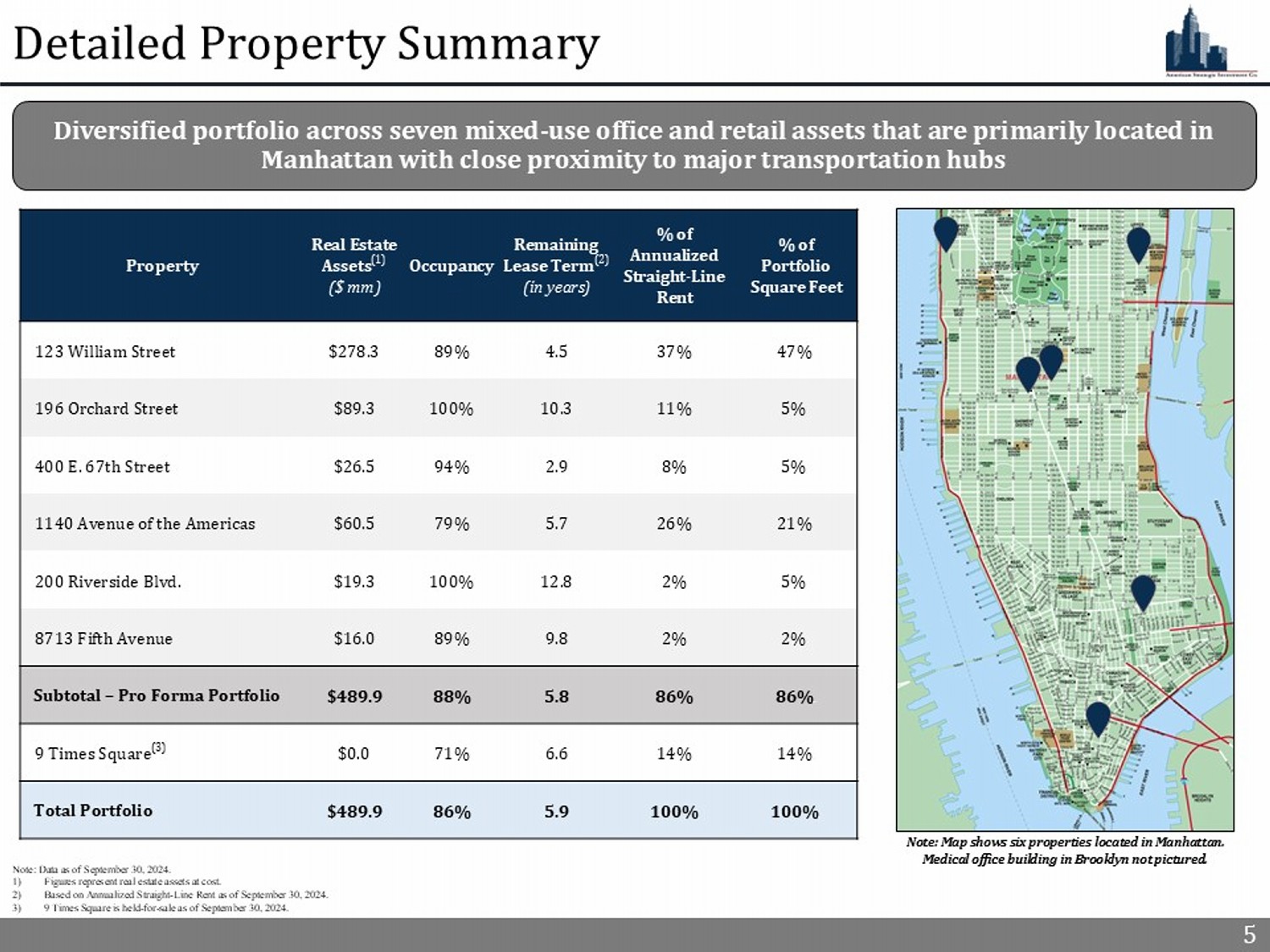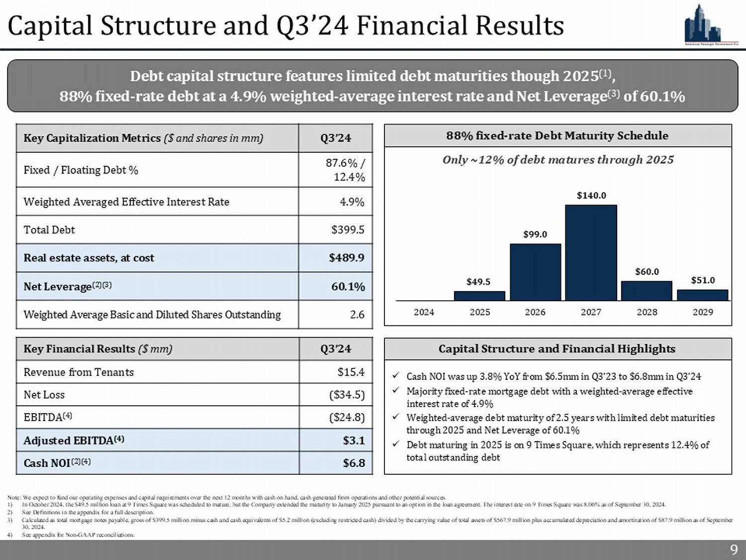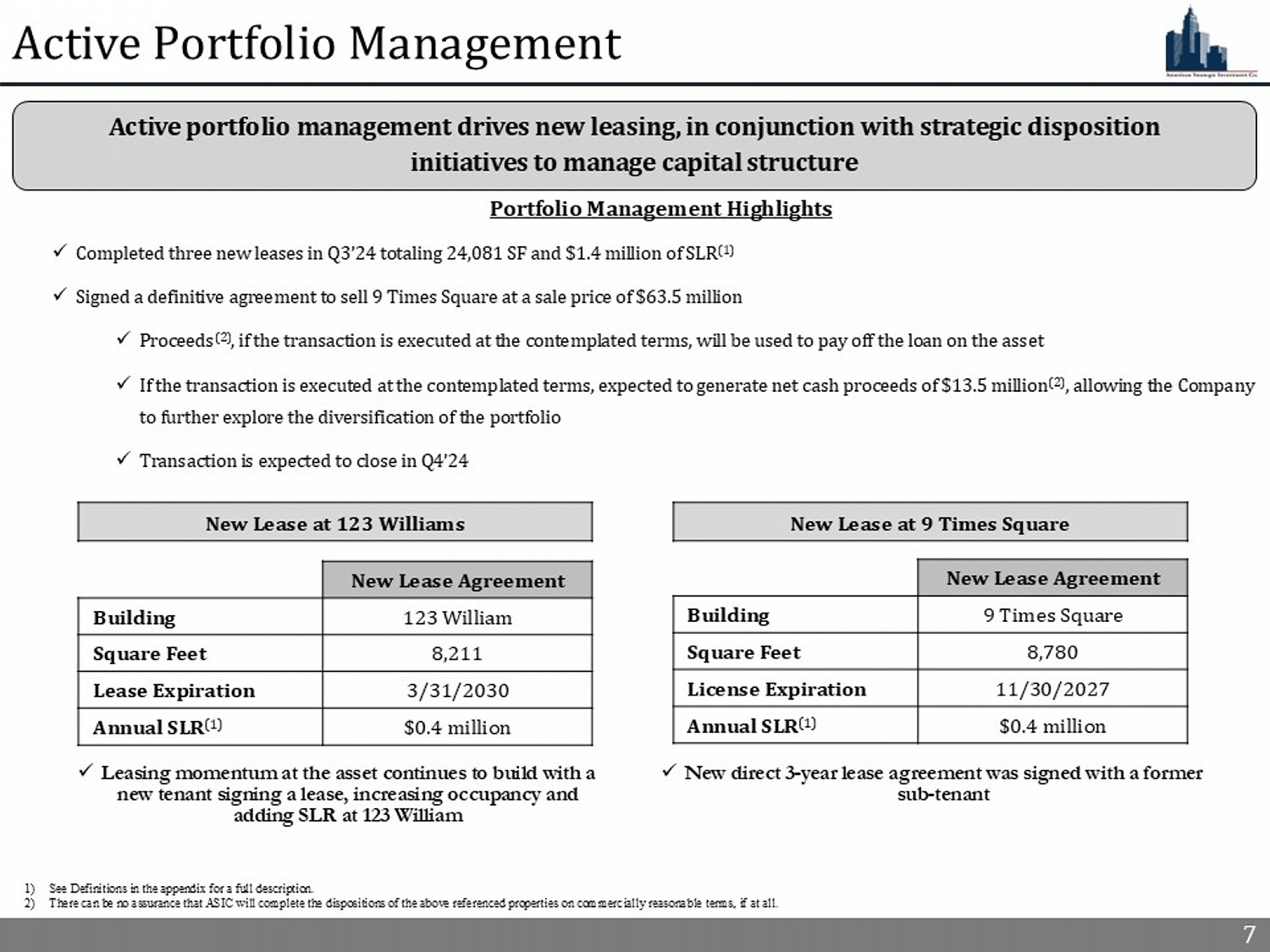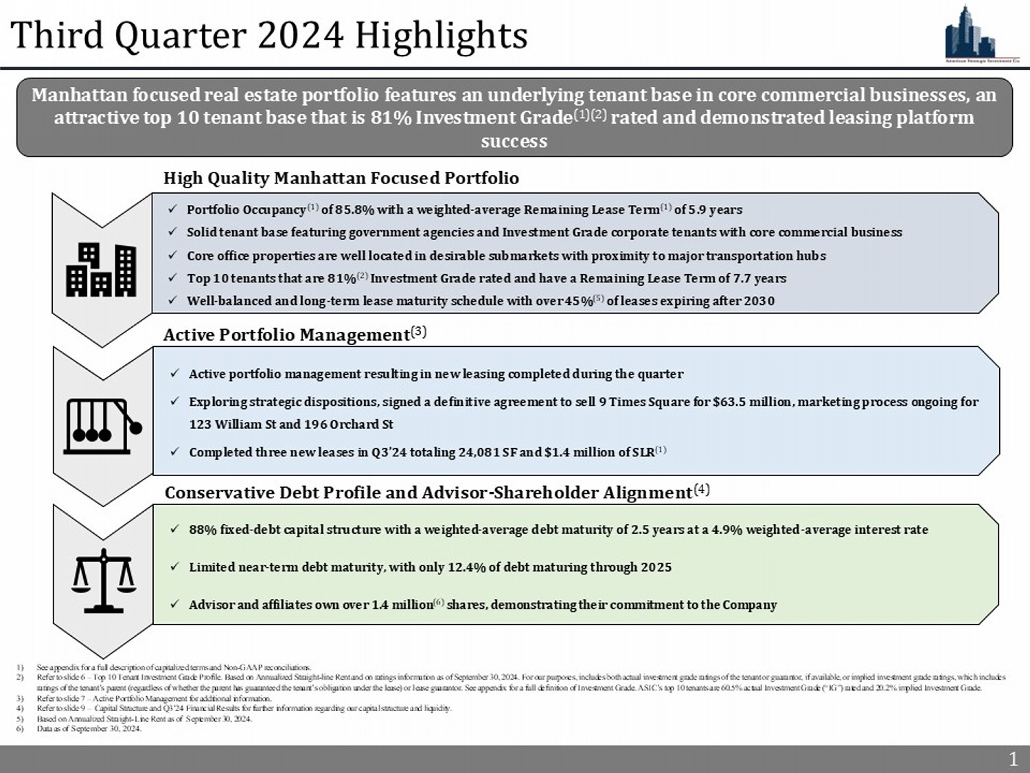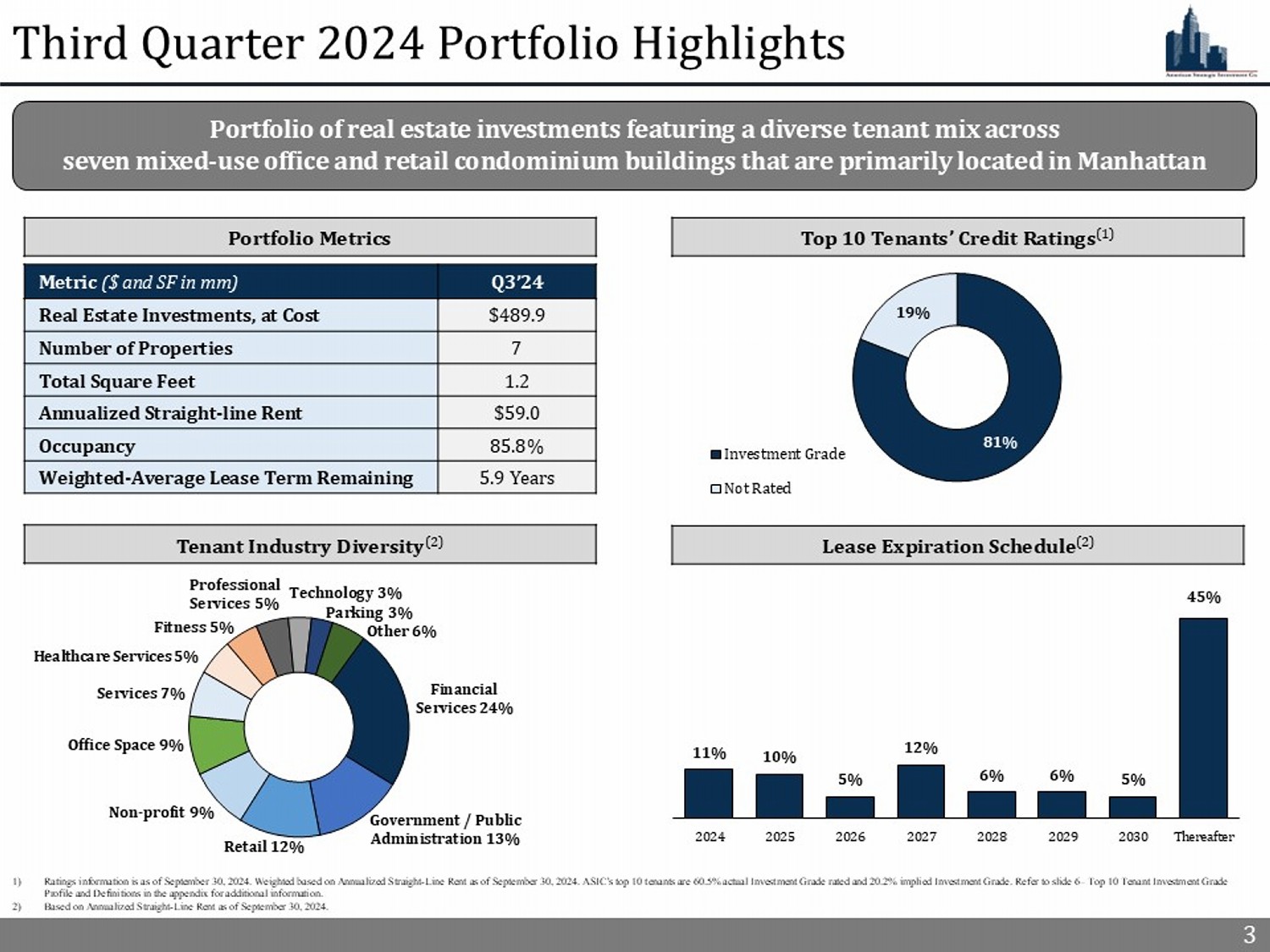 1 Third Quarter 2024 Highlights 1) See appendix for a full description of capitalized terms and Non - GAAP reconciliations. 2) Refer to slide 6 – Top 10 Tenant Investment Grade Profile. Based on Annualized Straight - line Rent and on ratings information as of September 30, 2024. For our purposes, includes both actual investment grade ratings of the tenant or guarantor, if availab le, or implied investment grade ratings, which includes ratings of the tenant’s parent (regardless of whether the parent has guaranteed the tenant’s obligation under the lease) or l eas e guarantor. See appendix for a full definition of Investment Grade. ASIC’s top 10 tenants are 60.5% actual Investment Grade (“I G”) rated and 20.2% implied Investment Grade. 3) Refer to slide 7 – Active Portfolio Management for additional information. 4) Refer to slide 9 – Capital Structure and Q3’24 Financial Results for further information regarding our capital structure and liquidity. 5) Based on Annualized Straight - Line Rent as of September 30, 2024. 6) Data as of September 30, 2024 . 1 Manhattan focused real estate portfolio features an underlying tenant base in core commercial businesses, an attractive top 10 tenant base that is 81% Investment Grade (1)(2) rated and demonstrated leasing platform success x Portfolio Occupancy (1) of 85.8% with a weighted - average Remaining Lease Term (1) of 5.9 years x Solid tenant base featuring government agencies and Investment Grade corporate tenants with core commercial business x Core office properties are well located in desirable submarkets with proximity to major transportation hubs x Top 10 tenants that are 81% (2) Investment Grade rated and have a Remaining Lease Term of 7.7 years x Well - balanced and long - term lease maturity schedule with over 45 % (5) of leases expiring after 2030 x Active portfolio management resulting in new leasing completed during the quarter x Exploring strategic dispositions, signed a definitive agreement to sell 9 Times Square for $63.5 million, marketing process o ngo ing for 123 William St and 196 Orchard St x Completed three new leases in Q3’24 totaling 24,081 SF and $1.4 million of SLR (1) x 88% fixed - debt capital structure with a weighted - average debt maturity of 2.5 years at a 4.9% weighted - average interest rate x Limited near - term debt maturity, with only 12.4% of debt maturing through 2025 x Advisor and affiliates own over 1.4 million (6) shares, demonstrating their commitment to the Company High Quality Manhattan Focused Portfolio Active Portfolio Management (3) Conservative Debt Profile and Advisor - Shareholder Alignment (4)