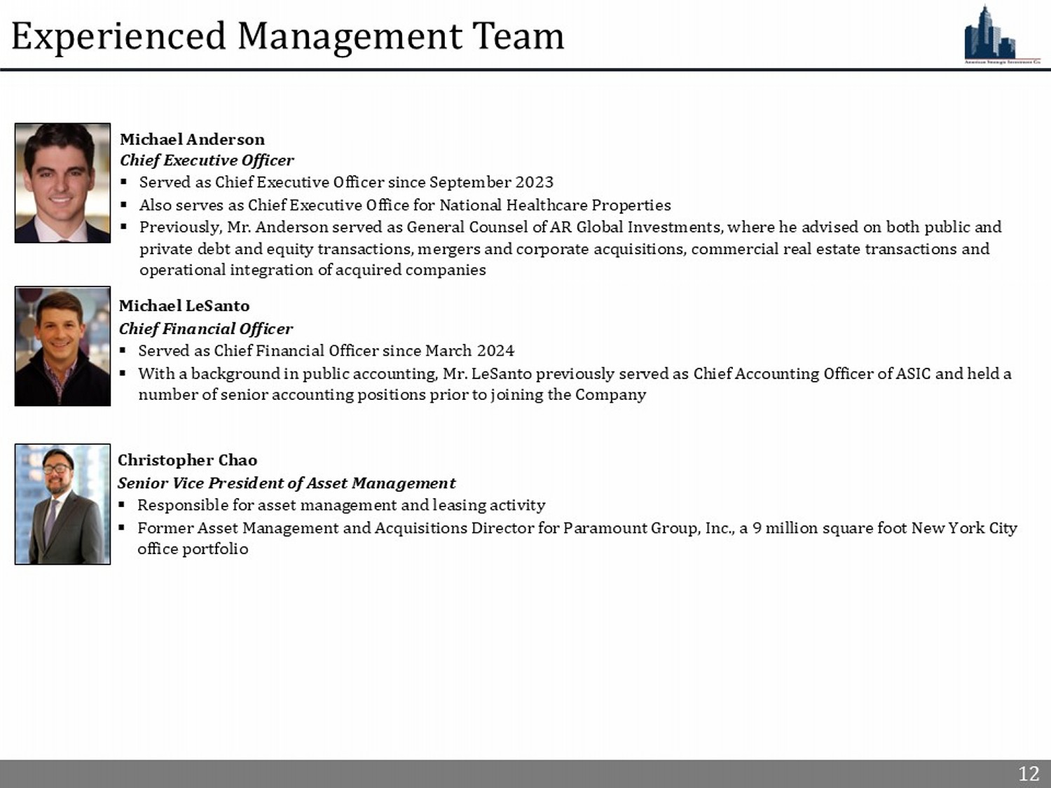 10 10 ASIC’s capital structure is composed of majority fixed - rate mortgage debt, limiting adverse effects from rising interests Only ~12% of debt matures through 2025 (2) Compares favorably to prevailing interest rate market Represents modest leverage profile Key Capitalization Metrics 10 Capital structure features limited near - term debt maturities, 88% fixed - rate debt and Net Leverage of 60.1% (1) Capital Structure Highlights 88% Fixed - Rate Capital structure features 88% fixed - rate debt, Net Leverage of 60.1% (1) , a Weighted - Average Interest Rate of 4.9%, and a Weighted - Average Debt Maturity of 2.5 years, continues to contribute to the Company's overall success 2.5 Year Weighted - Average Debt Maturity 4.9% Weighted - Average Interest Rate 60.1% Net Leverage 1) Calculated as total mortgage notes payable, gross of $399.5 million minus cash and cash equivalents of $5.2 million (excludin g r estricted cash) divided by the carrying value of total assets of $567.9 million plus accumulated depreciation and amortizatio n o f $87.9 million as of September 30, 2024. 2) In October 2024, the $49.5 million loan at 9 Times Square was scheduled to mature, but the Company extended the maturity to J anu ary 2025 pursuant to an option in the loan agreement . The interest rate on 9 Times Square was 8.06% as of September 30, 2024.