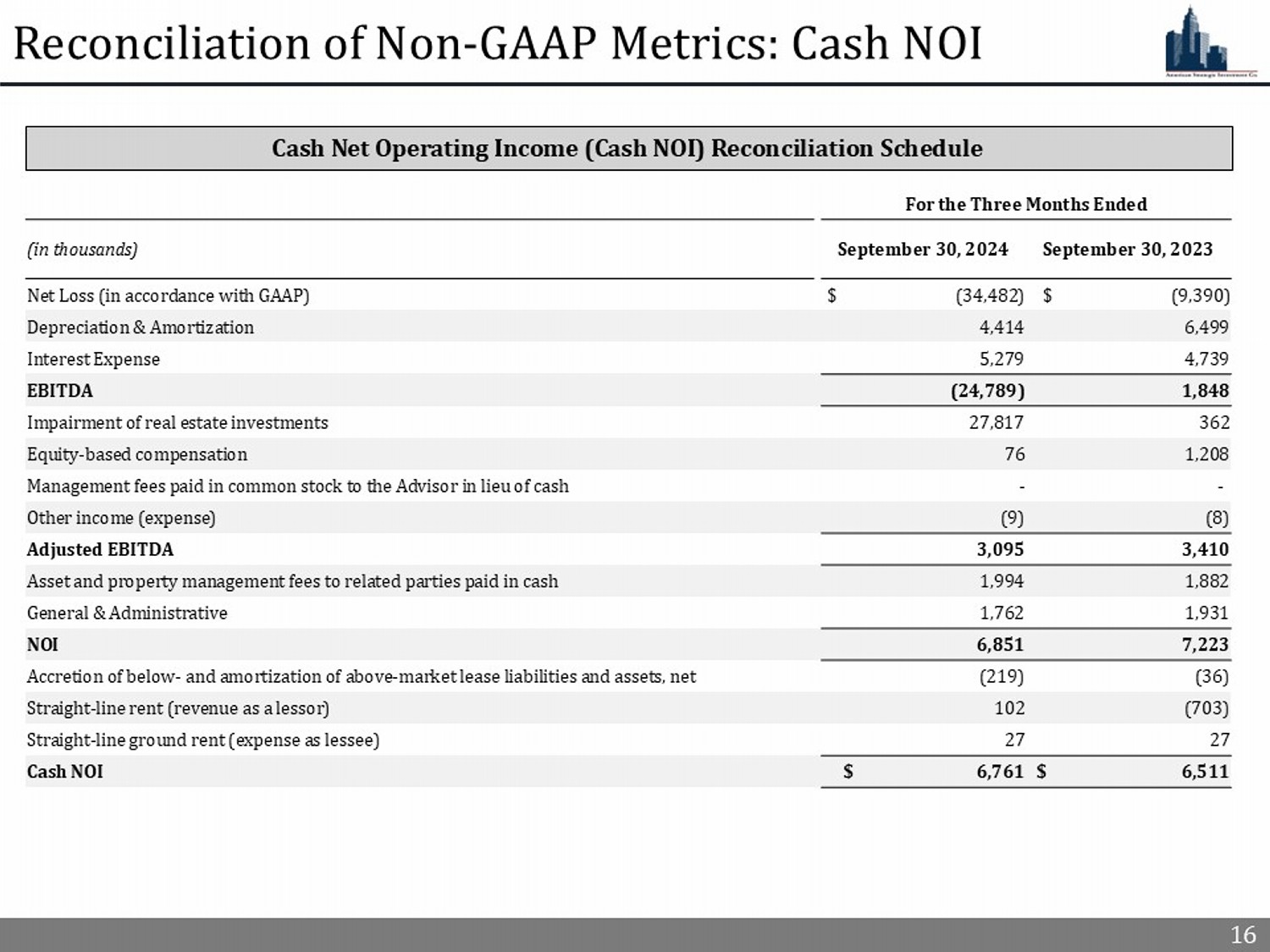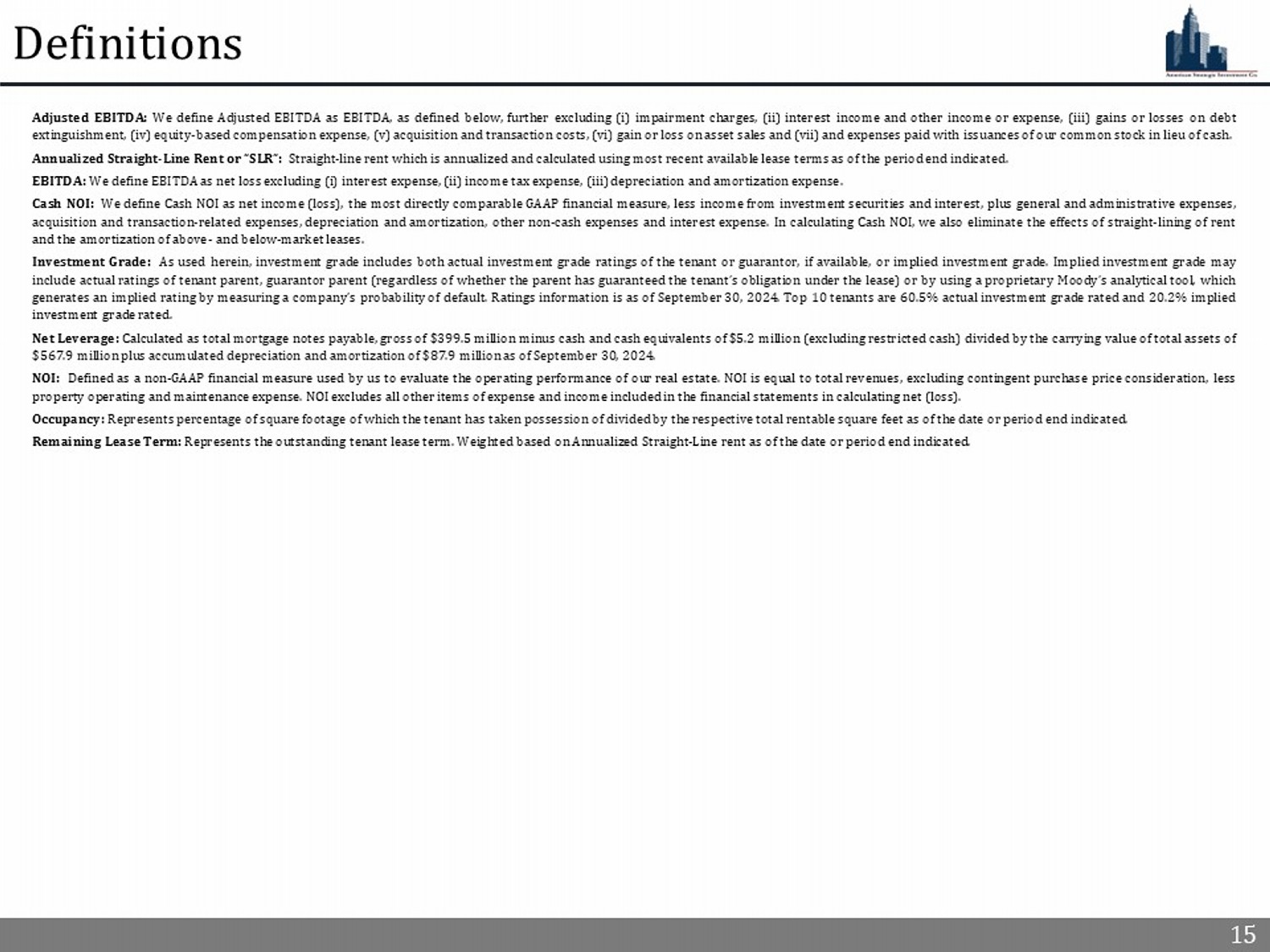 15 15 Definitions Adjusted EBITDA : We define Adjusted EBITDA as EBITDA, as defined below, further excluding ( i ) impairment charges, (ii) interest income and other income or expense, (iii) gains or losses on debt extinguishment, (iv) equity - based compensation expense, (v) acquisition and transaction costs, (vi) gain or loss on asset sales and (vii) and expenses paid with issuances of our common stock in lieu of cash . Annualized Straight - Line Rent or “SLR” : Straight - line rent which is annualized and calculated using most recent available lease terms as of the period end indicated . EBITDA : We define EBITDA as net loss excluding ( i ) interest expense, (ii) income tax expense, (iii) depreciation and amortization expense . Cash NOI : We define Cash NOI as net income (loss), the most directly comparable GAAP financial measure, less income from investment securities and interest, plus general and administrative expenses, acquisition and transaction - related expenses, depreciation and amortization, other non - cash expenses and interest expense . In calculating Cash NOI, we also eliminate the effects of straight - lining of rent and the amortization of above - and below - market leases . Investment Grade : As used herein, investment grade includes both actual investment grade ratings of the tenant or guarantor, if available, or implied investment grade . Implied investment grade may include actual ratings of tenant parent, guarantor parent (regardless of whether the parent has guaranteed the tenant’s obligation under the lease) or by using a proprietary Moody’s analytical tool, which generates an implied rating by measuring a company’s probability of default . Ratings information is as of September 30 , 2024 . Top 10 tenants are 60 . 5 % actual investment grade rated and 20 . 2 % implied investment grade rated . Net Leverage : Calculated as total mortgage notes payable, gross of $ 399 . 5 million minus cash and cash equivalents of $ 5 . 2 million (excluding restricted cash) divided by the carrying value of total assets of $ 567 . 9 million plus accumulated depreciation and amortization of $ 87 . 9 million as of September 30 , 2024 . NOI : Defined as a non - GAAP financial measure used by us to evaluate the operating performance of our real estate . NOI is equal to total revenues, excluding contingent purchase price consideration, less property operating and maintenance expense . NOI excludes all other items of expense and income included in the financial statements in calculating net (loss) . Occupancy : Represents percentage of square footage of which the tenant has taken possession of divided by the respective total rentable square feet as of the date or period end indicated . Remaining Lease Term : Represents the outstanding tenant lease term . Weighted based on Annualized Straight - Line rent as of the date or period end indicated .