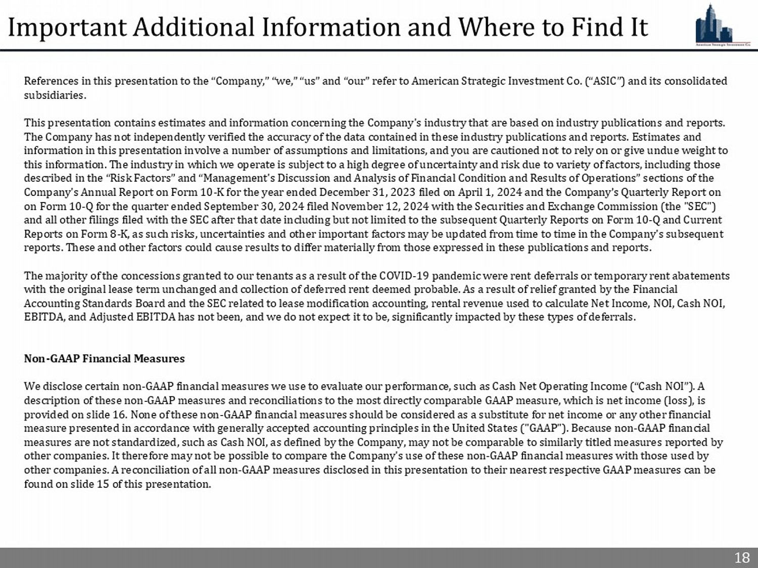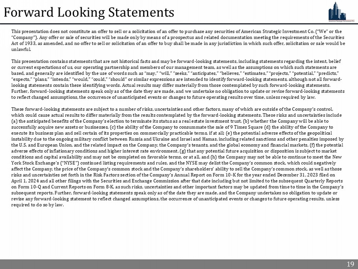 18 18 Important Additional Information and Where to Find It References in this presentation to the “Company,” “we,” “us” and “our” refer to American Strategic Investment Co. (“ASIC”) an d i ts consolidated subsidiaries. This presentation contains estimates and information concerning the Company's industry that are based on industry publication s a nd reports. The Company has not independently verified the accuracy of the data contained in these industry publications and reports. Est ima tes and information in this presentation involve a number of assumptions and limitations, and you are cautioned not to rely on or giv e u ndue weight to this information. The industry in which we operate is subject to a high degree of uncertainty and risk due to variety of fact ors , including those described in the “Risk Factors” and “Management's Discussion and Analysis of Financial Condition and Results of Operations” s ect ions of the Company's Annual Report on Form 10 - K for the year ended December 31, 2023 filed on April 1, 2024 and the Company’s Quarterly Rep ort on on Form 10 - Q for the quarter ended September 30, 2024 filed November 12, 2024 with the Securities and Exchange Commission (the "SE C") and all other filings filed with the SEC after that date including but not limited to the subsequent Quarterly Reports on For m 1 0 - Q and Current Reports on Form 8 - K, as such risks, uncertainties and other important factors may be updated from time to time in the Company's subsequent reports. These and other factors could cause results to differ materially from those expressed in these publications and repo rts . The majority of the concessions granted to our tenants as a result of the COVID - 19 pandemic were rent deferrals or temporary ren t abatements with the original lease term unchanged and collection of deferred rent deemed probable. As a result of relief granted by the Fin ancial Accounting Standards Board and the SEC related to lease modification accounting, rental revenue used to calculate Net Income, NO I, Cash NOI, EBITDA, and Adjusted EBITDA has not been, and we do not expect it to be, significantly impacted by these types of deferrals. Non - GAAP Financial Measures We disclose certain non - GAAP financial measures we use to evaluate our performance, such as Cash Net Operating Income (“Cash NOI ”). A description of these non - GAAP measures and reconciliations to the most directly comparable GAAP measure, which is net income (lo ss), is provided on slide 16. None of these non - GAAP financial measures should be considered as a substitute for net income or any other financial measure presented in accordance with generally accepted accounting principles in the United States ("GAAP"). Because non - GAAP fi nancial measures are not standardized, such as Cash NOI, as defined by the Company, may not be comparable to similarly titled measure s r eported by other companies. It therefore may not be possible to compare the Company's use of these non - GAAP financial measures with those u sed by other companies. A reconciliation of all non - GAAP measures disclosed in this presentation to their nearest respective GAAP measu res can be found on slide 15 of this presentation. 18