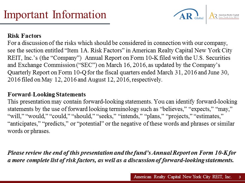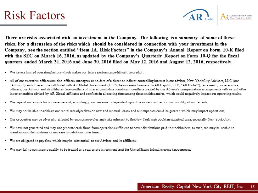 Risk Factors There are risks associated with an investment in the Company. The following is a summary of some of these risks. For a discussion of the risks which should be considered in connection with your investment in the Company, see the section entitled “Item 1A . Risk Factors” in the Company’s Annual Report on Form 10 - K filed with the SEC on March 16, 2016, as updated by the Company’s Quarterly Report on Form 10 - Q for the fiscal quarters ended March 31, 2016 and June 30, 2016 filed on May 12, 2016 and August 12, 2016, respectively. ▪ We have a limited operating history which makes our future performance difficult to predict; ▪ All of our executive officers are also officers, managers or holders of a direct or indirect controlling interest in our advi sor , New York City Advisors, LLC (our "Advisor") and other entities affiliated with AR Global Investments, LLC (the successor business to AR Capital, LLC, "AR Glob al" ); as a result, our executive officers, our Advisor and its affiliates face conflicts of interest, including significant conflicts created by our Advisor's co mpensation arrangements with us and other investor entities advised by AR Global affiliates and conflicts in allocating time among these entities and us, which could n ega tively impact our operating results; ▪ We depend on tenants for our revenue and, accordingly, our revenue is dependent upon the success and economic viability of ou r t enants; ▪ We may not be able to achieve our rental rate objectives on new and renewal leases and our expenses could be greater, which m ay impact operations; ▪ Our properties may be adversely affected by economic cycles and risks inherent to the New York metropolitan statistical area, es pecially New York City; ▪ We have not generated and may not generate cash flows from operations sufficient to cover distributions paid to stockholders; as such, we may be unable to maintain cash distributions or increase distributions over time; ▪ We are obligated to pay fees, which may be substantial, to our Advisor and its affiliates; ▪ We may fail to continue to qualify to be treated as a real estate investment trust for United States federal income tax purpo ses ; American Realty Capital New York City REIT, Inc. 15