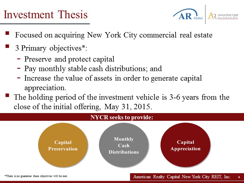 Risk Factors For a discussion of the risks which should be considered in connection with our company, see the section entitled “Item 1A. Risk Factors” in American Realty Capital New York City REIT, Inc.’s (the “Company”) Annual Report on Form 10 - K filed with the U.S. Securities and Exchange Commission (“SEC”) on March 16, 2016, as updated by the Company’s Quarterly Report on Form 10 - Q for the fiscal quarters ended March 31, 2016 and June 30, 2016 filed on May 12, 2016 and August 12, 2016, respectively. Forward - Looking Statements This presentation may contain forward - looking statements. You can identify forward - looking statements by the use of forward looking terminology such as “believes,” “expects,” “may,” “will,” “would,” “could,” “should,” “seeks,” “intends,” “plans,” “projects,” “estimates,” “anticipates,” “predicts,” or “potential” or the negative of these words and phrases or similar words or phrases. Please review the end of this presentation and the fund’s Annual Report on Form 10 - K for a more complete list of risk factors, as well as a discussion of forward - looking statements. American Realty Capital New York City REIT, Inc. 3 Important Information