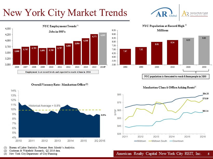 A Public Non - Traded Real Estate Investment Trust* ▪ Focused on acquiring New York City commercial real estate ▪ 3 Primary objectives*: - Preserve and protect capital - Pay monthly stable cash distributions; and - Increase the value of assets in order to generate capital appreciation. ▪ The holding period of the investment vehicle is 3 - 6 years from the close of the initial offering, May 31, 2015. American Realty Capital New York City REIT, Inc. 4 *There is no guarantee these objectives will be met. NYCR seeks to provide: Investment Thesis