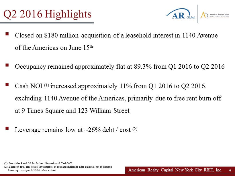 American Realty Capital New York City REIT, Inc. 5 (1) Bureau of Labor Statistics. Forecast from Moody’s Analytics. (2) Cushman & Wakefield Research, Q2 2016 data. (3) New York City Department of City Planning NYC Employment Trends NYC Population at Record High Manhattan Class A Office Asking Rents (1) (3) (2) NYC population is forecasted to reach 8.8mm people in 2030 New York City Market Trends Overall Vacancy Rate - Manhattan Office (2) 7.07 7.32 8.01 8.24 8.55 8.82 5.00 5.50 6.00 6.50 7.00 7.50 8.00 8.50 9.00 9.50 1980 1990 2000 2010 2020 2030 Millions 8.8% $84.28 $78.09 $62.24 3,666 3,745 3,795 3,691 3,709 3,797 3,885 3,984 4,108 4,272 4,335 3,000 3,250 3,500 3,750 4,000 4,250 4,500 2006 2007 2008 2009 2010 2011 2012 2013 2014 2015 2016F Jobs in 000's