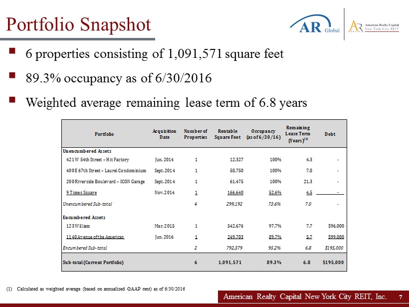 ▪ Closed on $180 million acquisition of a leasehold interest in 1140 Avenue of the Americas on June 15 th ▪ Occupancy remained approximately flat at 89.3% from Q1 2016 to Q2 2016 ▪ Cash NOI (1) increased approximately 11% from Q1 2016 to Q2 2016, excluding 1140 Avenue of the Americas, primarily due to free rent burn off at 9 Times Square and 123 William Street ▪ Leverage remains low at ~26% debt / cost (2) Confidential Material - Not for Distribution American Realty Capital New York City REIT, Inc. 6 (1) See slides 9 and 10 for further discussion of Cash NOI (2) Based on total real estate investments, at cost and mortgage note payable, net of deferred financing costs per 6/30/16 balance sheet Q2 2016 Highlights