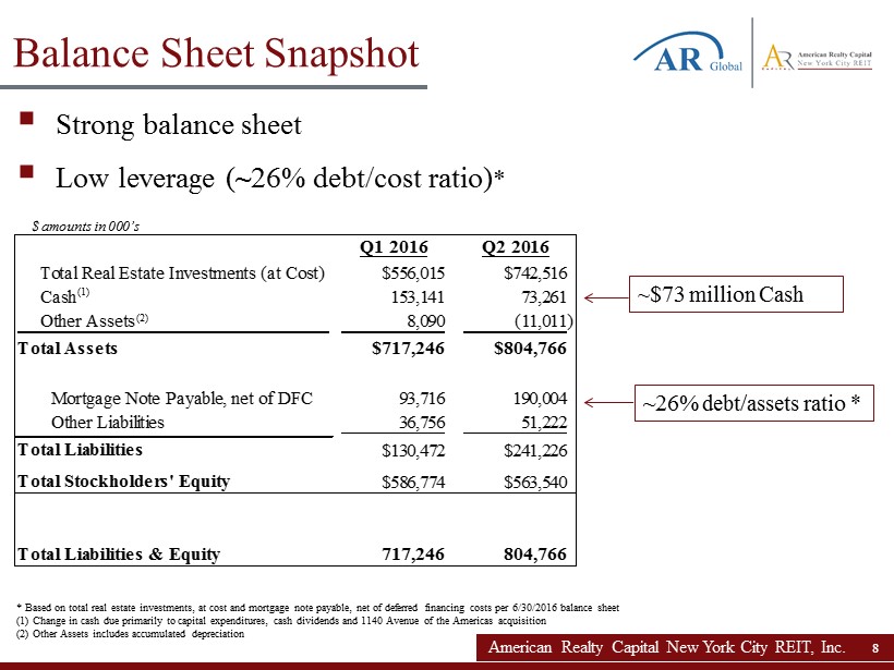 ▪ 6 properties consisting of 1,091,571 square feet ▪ 89.3% occupancy as of 6/30/2016 ▪ Weighted average remaining lease term of 6.8 years Confidential Material - Not for Distribution American Realty Capital New York City REIT, Inc. 7 (1) Calculated as weighted average (based on annualized GAAP rent) as of 6/30/2016 Portfolio Snapshot Portfolio Acquisition Date Number of Properties Rentable Square Feet Occupancy (as of 6/30/16) Remaining Lease Term (Years) (1) Debt Unencumbered Assets 421 W 54th Street – Hit Factory Jun. 2014 1 12,327 100% 4.3 - 400 E 67th Street – Laurel Condominium Sept. 2014 1 58,750 100% 7.8 - 200 Riverside Boulevard – ICON Garage Sept. 2014 1 61,475 100% 21.3 - 9 Times Square Nov. 2014 1 166,640 52.6% 4.5 - Unencumbered Sub-total 4 299,192 73.6% 7.0 - Encumbered Assets 123 William Mar. 2015 1 542,676 97.7% 7.7 $96,000 1140 Avenue of the Americas Jun. 2016 1 249,703 89.7% 5.7 $99,000 Encumbered Sub-total 2 792,379 95.2% 6.8 $195,000 Sub-total (Current Portfolio) 6 1,091,571 89.3% 6.8 $195,000