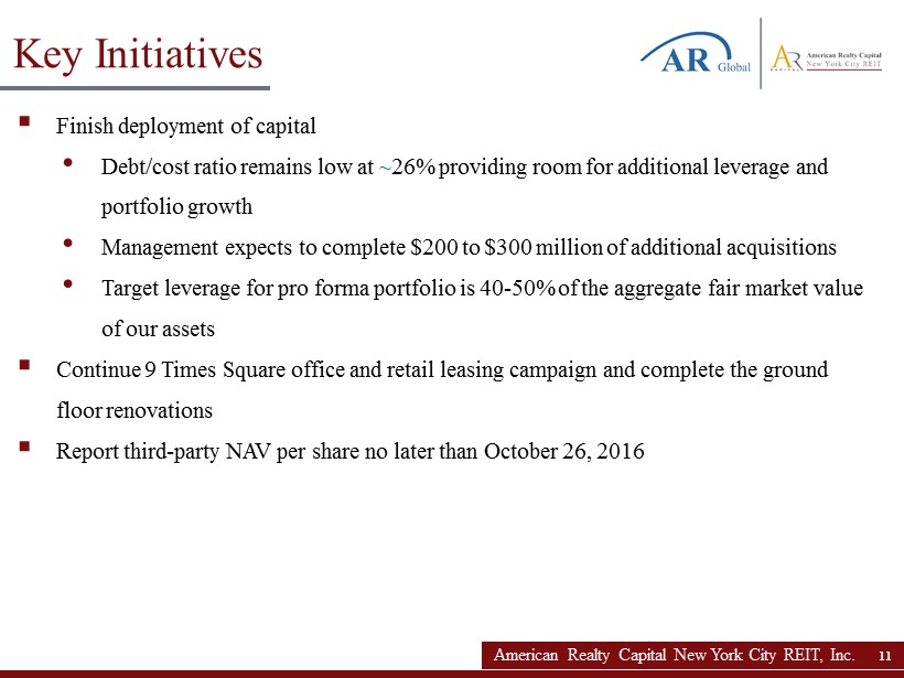Confidential Material - Not for Distribution American Realty Capital New York City REIT, Inc. 10 ▪ Cash net operating income ("Cash NOI") is a non - GAAP financial measure equal to net income (loss), the most directly comparable GAAP financial measure, less income from investment securities and interest, plus general and administrative expenses, acquisition an d transaction - related expenses, depreciation and amortization, other non - cash expenses and interest expense. In calculating Cash NOI, we also eliminate the effects of straight - lining of rent and the amortization of above and below market leases. Cash NOI should not be considered an a lternative to net income (loss) as an indication of our performance or to cash flows as a measure of our liquidity ▪ We use Cash NOI internally as a performance measure and believe Cash NOI provides useful information to investors regarding o ur financial condition and results of operations because it reflects only those income and expense items that are incurred at the property le vel. Therefore, we believe Cash NOI is a useful measure for evaluating the operating performance of our real estate assets and to make decisions ab out resource allocations. Further, we believe Cash NOI is useful to investors as performance measures because, when compared across period s, Cash NOI reflects the impact on operations from trends in occupancy rates, rental rates, operating costs and acquisition activity on a n u nlevered basis. Cash NOI excludes certain components from net income in order to provide results that are more closely related to a property's res ult s of operations. For example, interest expense is not linked to the operating performance of a real estate asset and Cash NOI is not affected by whether the financing is at the property level or corporate level. In addition, depreciation and amortization, because of historical cost ac counting and useful life estimates, may distort operating performance at the property level. Cash NOI presented by us may not be comparable to Ca sh NOI reported by other REITs that define Cash NOI differently. We believe that in order to facilitate a clear understanding of our operatin g r esults, Cash NOI should be examined in conjunction with net income (loss) as presented in our consolidated financial statements. Cash NOI Reconciliation (cont.)
