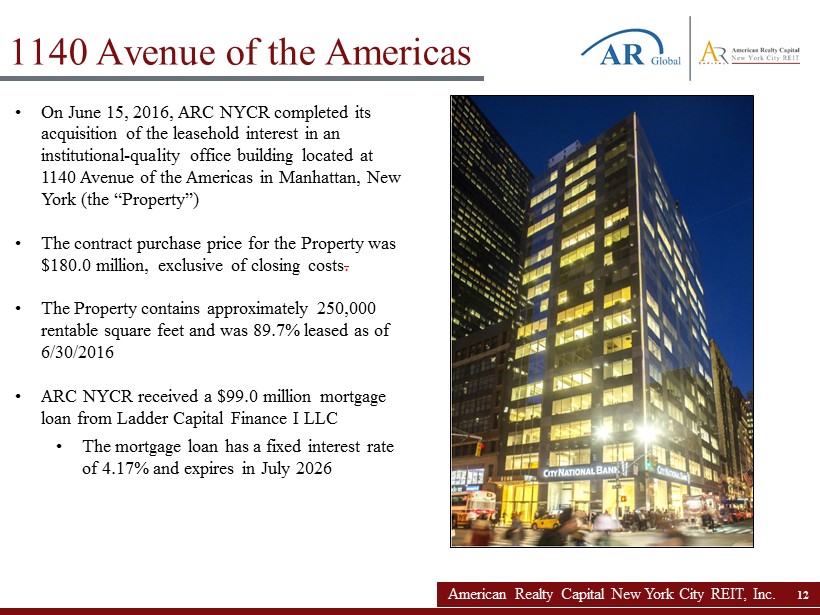American Realty Capital New York City REIT, Inc. 11 ▪ Finish deployment of capital • Debt/cost ratio remains low at ~ 26% providing room for additional leverage and portfolio growth • Management expects to complete $200 to $300 million of additional acquisitions • Target leverage for pro forma portfolio is 40 - 50% of the aggregate fair market value of our assets ▪ Continue 9 Times Square office and retail leasing campaign and complete the ground floor renovations ▪ Report third - party NAV per share no later than October 26, 2016 Key Initiatives