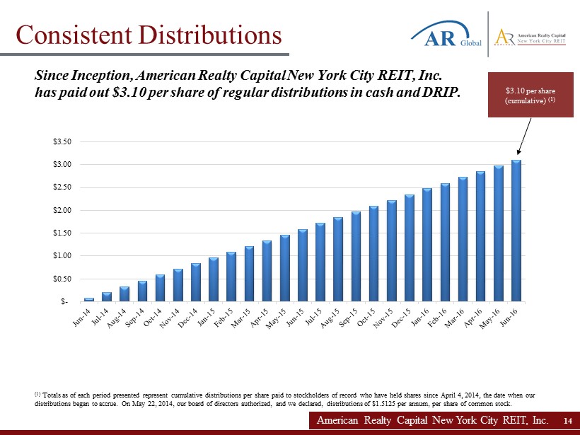 Michael Happel CEO & President Michael Ead Senior Vice President and Counsel Stephen Rothstein Associate Organizational Depth American Realty Capital New York City REIT, Inc. 13 Michael Weil Executive Chairman Elizabeth Tuppeny Independent Director Abby Wenzel Independent Director James Beckner Associate Joseph Metzinger Chief Accounting Officer Lee Elman Independent Director & Audit Chair Dennis Estok Asset Manager Nicholas Radesca Interim CFO and Treasurer Management Team Board of Directors Patrick O’Malley CIO Zachary Pomerantz V.P. Asset Management Alex O’Connor Associate