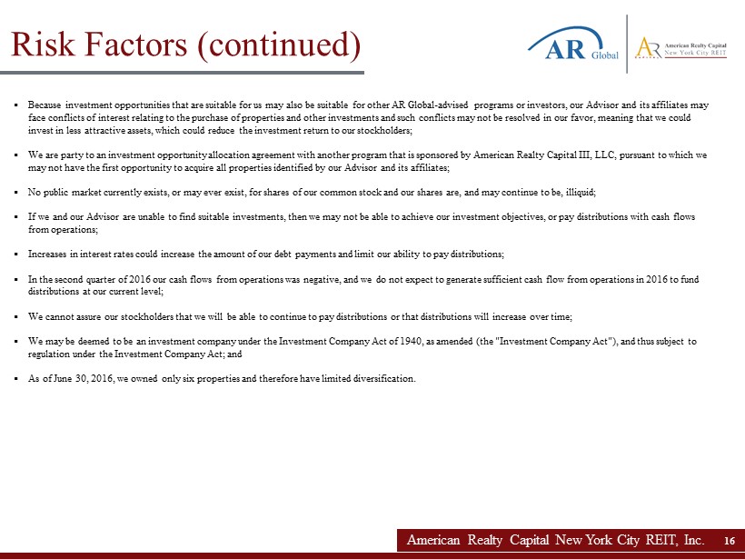 ▪ Because investment opportunities that are suitable for us may also be suitable for other AR Global - advised programs or investors , our Advisor and its affiliates may face conflicts of interest relating to the purchase of properties and other investments and such conflicts may not be resolve d i n our favor, meaning that we could invest in less attractive assets, which could reduce the investment return to our stockholders; ▪ We are party to an investment opportunity allocation agreement with another program that is sponsored by American Realty Capi tal III, LLC, pursuant to which we may not have the first opportunity to acquire all properties identified by our Advisor and its affiliates; ▪ No public market currently exists, or may ever exist, for shares of our common stock and our shares are, and may continue to be, illiquid; ▪ If we and our Advisor are unable to find suitable investments, then we may not be able to achieve our investment objectives, or pay distributions with cash flows from operations; ▪ Increases in interest rates could increase the amount of our debt payments and limit our ability to pay distributions; ▪ In the second quarter of 2016 our cash flows from operations was negative, and we do not expect to generate sufficient cash f low from operations in 2016 to fund distributions at our current level; ▪ We cannot assure our stockholders that we will be able to continue to pay distributions or that distributions will increase o ver time; ▪ We may be deemed to be an investment company under the Investment Company Act of 1940, as amended (the "Investment Company Ac t") , and thus subject to regulation under the Investment Company Act; and ▪ As of June 30, 2016, we owned only six properties and therefore have limited diversification. American Realty Capital New York City REIT, Inc. 16 Risk Factors (continued)