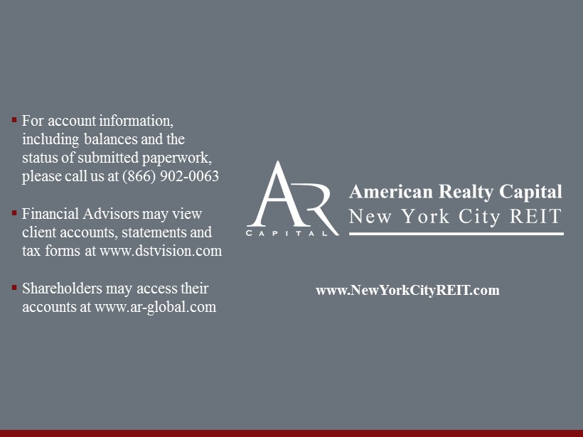 www.NewYorkCityREIT.com ▪ For account information, including balances and the status of submitted paperwork, please call us at (866) 902 - 0063 ▪ Financial Advisors may view client accounts, statements and tax forms at www.dstvision.com ▪ Shareholders may access their accounts at www.ar - global.com