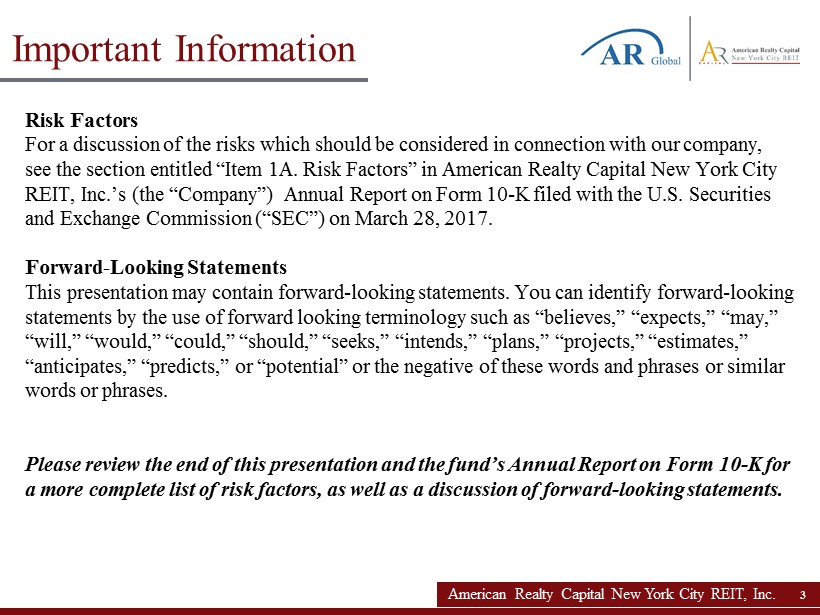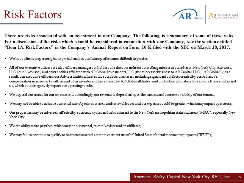 Risk Factors There are risks associated with an investment in our Company. The following is a summary of some of these risks. For a discussion of the risks which should be considered in connection with our Company, see the section entitled “Item 1A. Risk Factors” in the Company’s Annual Report on Form 10 - K filed with the SEC on March 28, 2017. ▪ We have a limited operating history which makes our future performance difficult to predict; ▪ All of our executive officers are also officers, managers or holders of a direct or indirect controlling interest in our advi sor , New York City Advisors, LLC (our "Advisor") and other entities affiliated with AR Global Investments, LLC (the successor business to AR Capital, LLC, "A R Global"); as a result, our executive officers, our Advisor and its affiliates face conflicts of interest, including significant conflicts cr eat ed by our Advisor’s compensation arrangements with us and other investor entities advised by AR Global affiliates, and conflicts in allocating ti me among these entities and us, which could negatively impact our operating results; ▪ We depend on tenants for our revenue and, accordingly, our revenue is dependent upon the success and economic viability of ou r t enants; ▪ We may not be able to achieve our rental rate objectives on new and renewal leases and our expenses could be greater, which m ay impact operations; ▪ Our properties may be adversely affected by economic cycles and risks inherent to the New York metropolitan statistical area ("M SA"), especially New York City; ▪ We are obligated to pay fees, which may be substantial, to our Advisor and its affiliates; ▪ We may fail to continue to qualify to be treated as a real estate investment trust for United States federal income tax purpo ses ("REIT"); American Realty Capital New York City REIT, Inc. 15