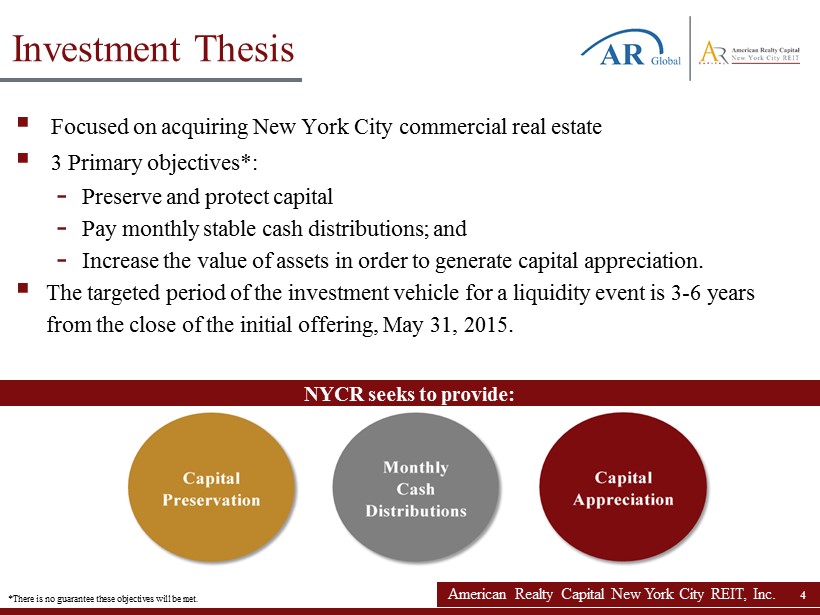 Risk Factors For a discussion of the risks which should be considered in connection with our company, see the section entitled “Item 1A. Risk Factors” in American Realty Capital New York City REIT, Inc.’s (the “Company”) Annual Report on Form 10 - K filed with the U.S. Securities and Exchange Commission (“SEC”) on March 28, 2017. Forward - Looking Statements This presentation may contain forward - looking statements. You can identify forward - looking statements by the use of forward looking terminology such as “believes,” “expects,” “may,” “will,” “would,” “could,” “should,” “seeks,” “intends,” “plans,” “projects,” “estimates,” “anticipates,” “predicts,” or “potential” or the negative of these words and phrases or similar words or phrases. Please review the end of this presentation and the fund’s Annual Report on Form 10 - K for a more complete list of risk factors, as well as a discussion of forward - looking statements. American Realty Capital New York City REIT, Inc. 3 Important Information