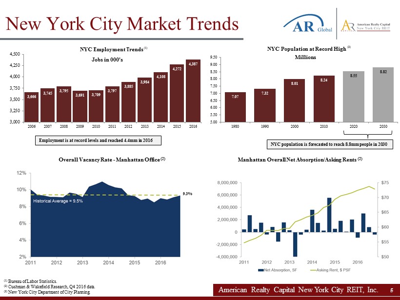 A Public Non - Traded Real Estate Investment Trust* ▪ Focused on acquiring New York City commercial real estate ▪ 3 Primary objectives*: - Preserve and protect capital - Pay monthly stable cash distributions; and - Increase the value of assets in order to generate capital appreciation. ▪ The targeted period of the investment vehicle for a liquidity event is 3 - 6 years from the close of the initial offering, May 31, 2015. American Realty Capital New York City REIT, Inc. 4 *There is no guarantee these objectives will be met. NYCR seeks to provide: Investment Thesis