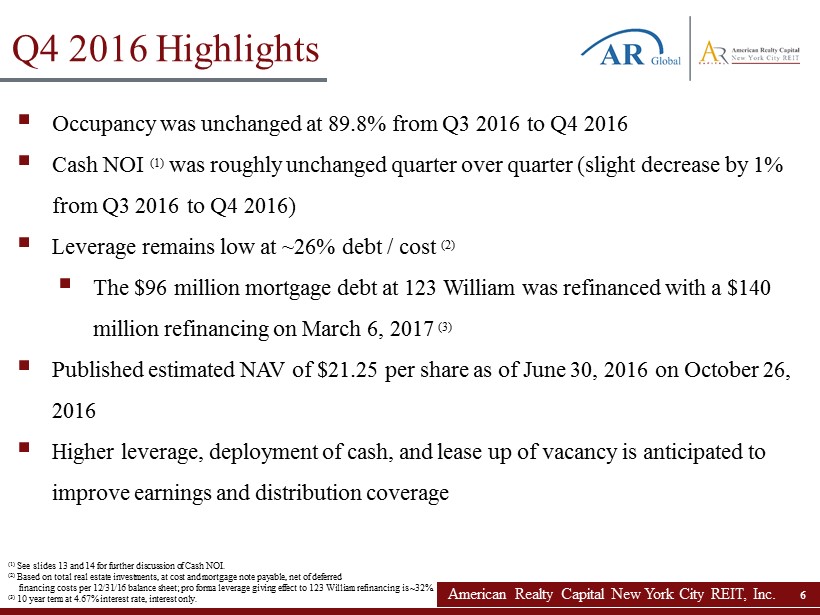 5 (1) Bureau of Labor Statistics. (2) Cushman & Wakefield Research, Q4 2016 data. (3) New York City Department of City Planning. NYC Employment Trends NYC Population at Record High Manhattan Overall Net Absorption/Asking Rents (2) (1) (3) NYC population is forecasted to reach 8.8mm people in 2030 New York City Market Trends Overall Vacancy Rate - Manhattan Office (2) 7.07 7.32 8.01 8.24 8.55 8.82 5.00 5.50 6.00 6.50 7.00 7.50 8.00 8.50 9.00 9.50 1980 1990 2000 2010 2020 2030 Millions 9.3% 3,666 3,745 3,795 3,691 3,709 3,797 3,885 3,984 4,108 4,272 4,387 3,000 3,250 3,500 3,750 4,000 4,250 4,500 2006 2007 2008 2009 2010 2011 2012 2013 2014 2015 2016 Jobs in 000's Employment is at record levels and reached 4.4mm in 2016 American Realty Capital New York City REIT, Inc.