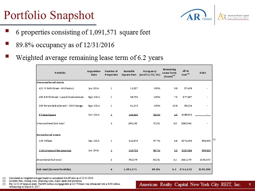 ▪ Occupancy was unchanged at 89.8% from Q3 2016 to Q4 2016 ▪ Cash NOI (1) was roughly unchanged quarter over quarter (slight decrease by 1% from Q3 2016 to Q4 2016) ▪ Leverage remains low at ~26% debt / cost (2) ▪ The $96 million mortgage debt at 123 William was refinanced with a $140 million refinancing on March 6, 2017 (3) ▪ Published estimated NAV of $21.25 per share as of June 30, 2016 on October 26, 2016 ▪ Higher leverage, deployment of cash, and lease up of vacancy is anticipated to improve earnings and distribution coverage Confidential Material - Not for Distribution American Realty Capital New York City REIT, Inc. 6 (1) See slides 13 and 14 for further discussion of Cash NOI. (2) Based on total real estate investments, at cost and mortgage note payable, net of deferred financing costs per 12/31/16 balance sheet; pro forma leverage giving effect to 123 William refinancing is ~32%. (3) 10 year term at 4.67% interest rate, interest only. Q4 2016 Highlights
