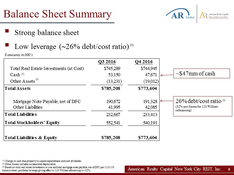 ▪ 6 properties consisting of 1,091,571 square feet ▪ 89.8% occupancy as of 12/31/2016 ▪ Weighted average remaining lease term of 6.2 years Confidential Material - Not for Distribution 7 (1) Calculated as weighted average (based on annualized GAAP rent) as of 12/31/2016. (2) Includes fees, closing costs, financing costs, major capex and prorations . (3) Per 12/31/16 balance sheet. The $96 million mortgage debt at 123 William was refinanced with a $140 million refinancing on March 6, 2017. Portfolio Snapshot Portfolio Acquisition Date Number of Properties Rentable Square Feet Occupancy (as of 12/31/16) Remaining Lease Term (Years) (1) All-in Cost (2) Debt Unencumbered Assets 421 W 54th Street – Hit Factory Jun. 2014 1 12,327 100% 3.8 $7,408 - 400 E 67th Street – Laurel Condominium Sept. 2014 1 58,750 100% 7.3 $77,387 - 200 Riverside Boulevard – ICON Garage Sept. 2014 1 61,475 100% 20.8 $9,226 - 9 Times Square Nov. 2014 1 166,640 56.0% 4.5 $188,925 - Unencumbered Sub-total 4 299,192 75.5% 6.6 $282,946 - Encumbered Assets 123 William Mar. 2015 1 542,676 97.7% 6.8 $274,493 $96,000 1140 Avenue of the Americas Jun. 2016 1 249,703 89.7% 5.3 $187,086 $99,000 Encumbered Sub-total 2 792,379 95.2% 6.1 $461,579 $195,000 Sub-total (Current Portfolio) 6 1,091,571 89.8% 6.2 $744,525 $195,000 American Realty Capital New York City REIT, Inc. (3)