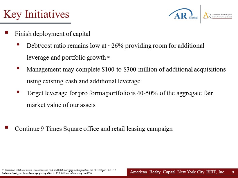 Confidential Material - Not for Distribution 8 Balance Sheet Summary ▪ Strong balance sheet ▪ Low leverage ( ~ 26% debt/cost ratio) (3) $ amounts in 000’s American Realty Capital New York City REIT, Inc. ~$47mm of cash 26% debt/cost ratio (3) (32% pro forma for 123 William refinancing) (1) Change in cash due primarily to capital expenditures and cash dividends. (2) Other Assets includes accumulated depreciation. (3) Based on total real estate investments at cost and total mortgage notes payable, net of DFC per 12/31/16 balance sheet; pro forma leverage giving effect to 123 William refinancing is ~32%. Q3 2016 Q4 2016 Total Real Estate Investments (at Cost) $745,289 $744,945 Cash 53,150 47,671 Other Assets (13,231) (19,012) Total Assets $785,208 $773,604 Mortgage Note Payable, net of DFC 190,672 191,328 Other Liabilities 41,995 42,085 Total Liabilities 232,667 233,413 Total Stockholders' Equity 552,541 540,191 Total Liabilities & Equity $785,208 $773,604 (1) (2)