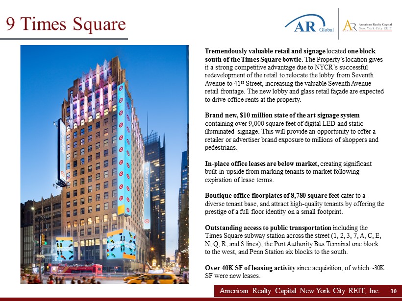10 Tremendously valuable retail and signage located one block south of the Times Square bowtie . The Property’s location gives it a strong competitive advantage due to NYCR’s successful redevelopment of the retail to relocate the lobby from Seventh Avenue to 41 st Street, increasing the valuable Seventh Avenue retail frontage. The new lobby and glass retail façade are expected to drive office rents at the property. Brand new, $10 million state of the art signage system containing over 9,000 square feet of digital LED and static illuminated signage. This will provide an opportunity to offer a retailer or advertiser brand exposure to millions of shoppers and pedestrians. In - place office leases are below market, creating significant built - in upside from marking tenants to market following expiration of lease terms. Boutique office floorplates of 8,780 square feet cater to a diverse tenant base, and attract high - quality tenants by offering the prestige of a full floor identity on a small footprint. Outstanding access to public transportation including the Times Square subway station across the street (1, 2, 3, 7, A, C, E, N, Q, R, and S lines), the Port Authority Bus Terminal one block to the west, and Penn Station six blocks to the south. Over 40K SF of leasing activity since acquisition, of which ~30K SF were new leases. 9 Times Square American Realty Capital New York City REIT, Inc.