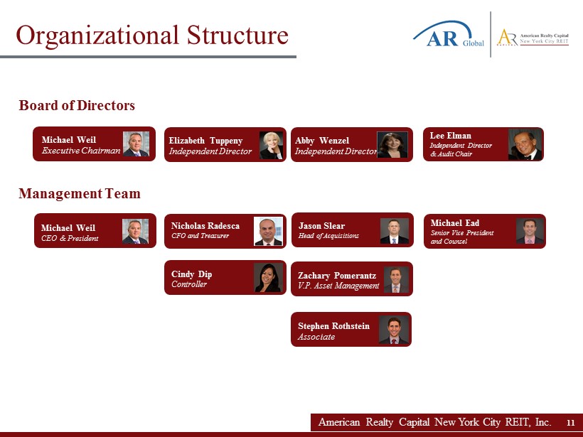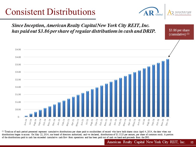 Organizational Structure 11 Michael Ead Senior Vice President and Counsel Stephen Rothstein Associate Elizabeth Tuppeny Independent Director Abby Wenzel Independent Director Michael Weil Executive Chairman Lee Elman Independent Director & Audit Chair Nicholas Radesca CFO and Treasurer Management Team Board of Directors Zachary Pomerantz V.P. Asset Management Michael Weil CEO & President Jason Slear Head of Acquisitions Cindy Dip Controller American Realty Capital New York City REIT, Inc.
