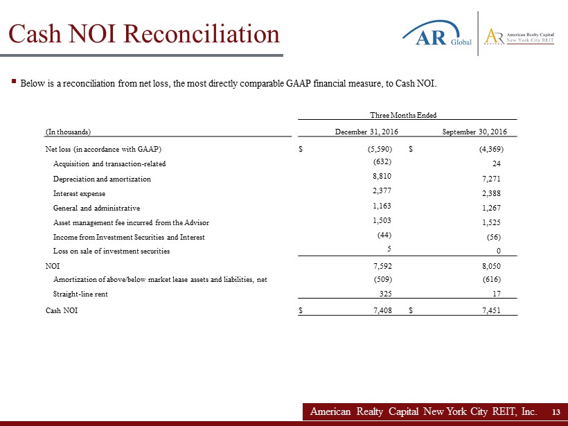 Since Inception, American Realty Capital New York City REIT, Inc. has paid out $3.86 per share of regular distributions in cash and DRIP. American Realty Capital New York City REIT, Inc. 12 Consistent Distributions $3.86 per share (cumulative) (1) (1) Totals as of each period presented represent cumulative distributions per share paid to stockholders of record who have held sh ares since April 4, 2014, the date when our distributions began to accrue. On May 22, 2014, our board of directors authorized, and we declared, distributions of $1.5125 per annum, per share of common stock. A portion of the distributions paid in cash has exceeded cumulative cash flow from operations and has been paid out of cash on hand and pr oceeds from the IPO. $- $0.50 $1.00 $1.50 $2.00 $2.50 $3.00 $3.50 $4.00 $4.50
