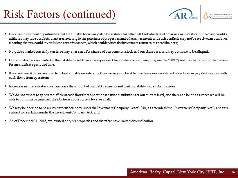 ▪ Because investment opportunities that are suitable for us may also be suitable for other AR Global - advised programs or investors , our Advisor and its affiliates may face conflicts of interest relating to the purchase of properties and other investments and such conflicts may no t be resolved in our favor, meaning that we could invest in less attractive assets, which could reduce the investment return to our stockholders; ▪ No public market currently exists, or may ever exist, for shares of our common stock and our shares are, and may continue to be, illiquid; ▪ Our stockholders are limited in their ability to sell their shares pursuant to our share repurchase program (the "SRP") and m ay have to hold their shares for an indefinite period of time; ▪ If we and our Advisor are unable to find suitable investments, then we may not be able to achieve our investment objectives, or pay distributions with cash flows from operations; ▪ Increases in interest rates could increase the amount of our debt payments and limit our ability to pay distributions; ▪ We do not expect to generate sufficient cash flow from operations to fund distributions at our current level, and there can b e n o assurance we will be able to continue paying cash distributions at our current level or at all; ▪ We may be deemed to be an investment company under the Investment Company Act of 1940, as amended (the "Investment Company Ac t") , and thus subject to regulation under the Investment Company Act; and ▪ As of December 31, 2016, we owned only six properties and therefore have limited diversification. American Realty Capital New York City REIT, Inc. 16 Risk Factors (continued)