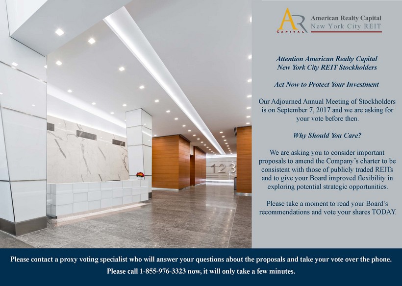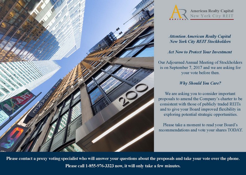 Please contact a proxy voting specialist who will answer your questions about the proposals and take your vote over the phone. Please call 1-855-976-3323 now, it will only take a few minutes. Attention American Realty Capital New York City REIT Stockholders Act Now to Protect Your Investment Our Adjourned Annual Meeting of Stockholders is on September 7, 2017 and we are asking for your vote before then. Why Should You Care? We are asking you to consider important proposals to amend the Company’s charter to be consistent with those of publicly traded REITs and to give your Board improved flexibility in exploring potential strategic opportunities. Please take a moment to read your Board’s recommendations and vote your shares TODAY. American Realty CapitalNew York City REIT