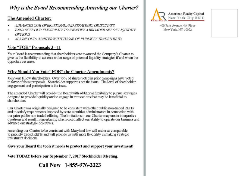 405 Park Avenue, 4th Floor New York, NY 10022 Why is the Board Recommending Amending our Charter? The Amended Charter: • ADVANCES OUR OPERATIONAL AND STRATEGIC OBJECTIVES • ENHANCES OUR FLEXIBILITY TO IDENTIFY A BROADER SET OF LIQUIDITY OPTIONS • ALIGNS OUR CHARTER WITH THOSE OF PUBLICLY TRADED REITs Vote “FOR” Proposals 3 - 11 Your Board is recommending that shareholders vote to amend the Company’s Charter to give us the flexibility to act on a wider range of potential liquidity strategies if and when the opportunities arise. Why Should You Vote “FOR” the Charter Amendments? Join your fellow shareholders. Over 75% of shares voted in prior campaigns have voted in favor of these proposals. Shareholder support is not the issue. The level of shareholder engagement and participation is the issue. The amended Charter will provide the Board with additional flexibility to pursue strategies designed to provide liquidity and to engage in transactions that may be beneficial to shareholders. Our Charter was originally designed to be consistent with other public non-traded REITs and to satisfy requirements imposed by state securities administrators in connection with our prior public non-traded offering. The limitations in our Charter may create interpretive questions and result in uncertainty, which could affect our ability to operate our business and advance our strategic objectives. Amending our Charter to be consistent with Maryland law will make us comparable to publicly traded REITs and will provide us with more flexibility in making strategic investment decisions. Give your Board the tools it needs to protect and support your investment! Vote TODAY before our September 7, 2017 Stockholder Meeting. American Realty CapitalNew York City REIT Call Now 1-855-976-3323