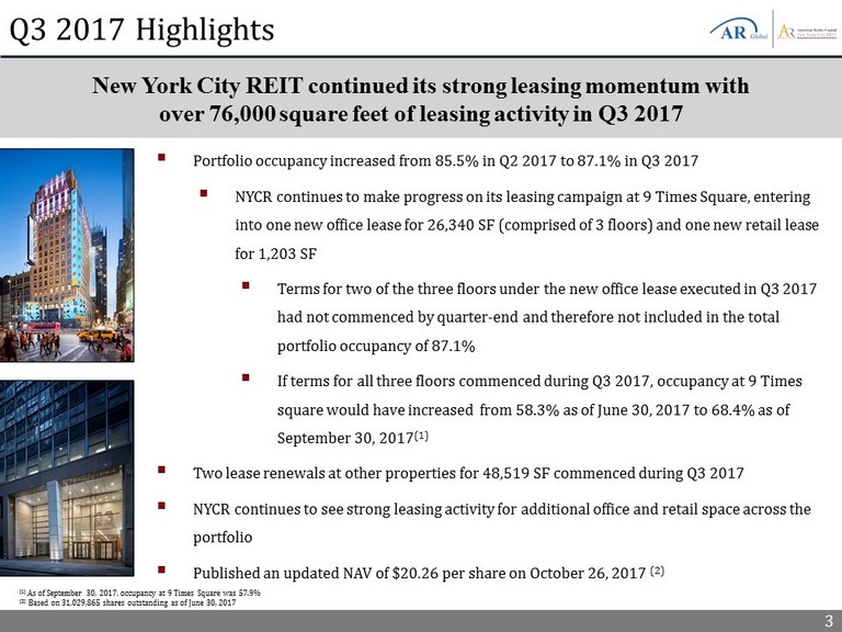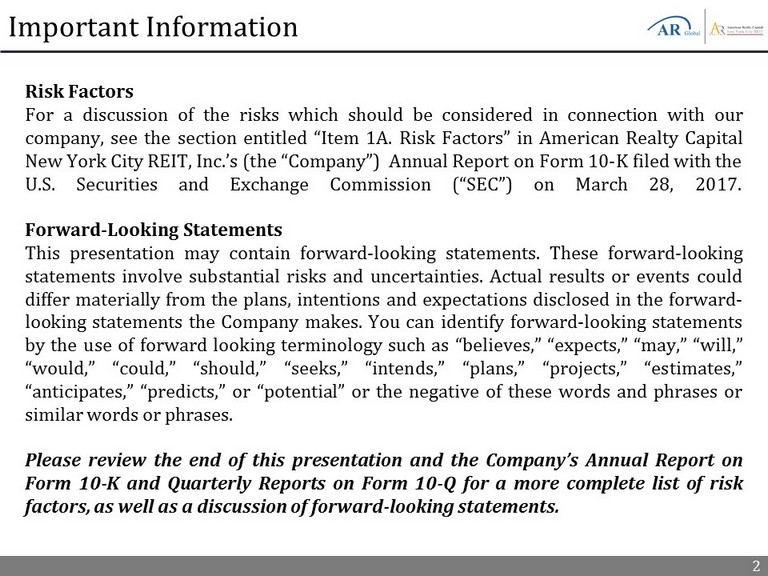 2 Important Information Risk Factors For a discussion of the risks which should be considered in connection with our company, see the section entitled “Item 1 A . Risk Factors” in American Realty Capital New York City REIT, Inc . ’s (the “Company”) Annual Report on Form 10 - K filed with the U . S . Securities and Exchange Commission (“SEC”) on March 28 , 2017 . Forward - Looking Statements This presentation may contain forward - looking statements . These forward - looking statements involve substantial risks and uncertainties . Actual results or events could differ materially from the plans, intentions and expectations disclosed in the forward - looking statements the Company makes . You can identify forward - looking statements by the use of forward looking terminology such as “believes,” “expects,” “may,” “will,” “would,” “could,” “should,” “seeks,” “intends,” “plans,” “projects,” “estimates,” “anticipates,” “predicts,” or “potential” or the negative of these words and phrases or similar words or phrases . Please review the end of this presentation and the Company’s Annual Report on Form 10 - K and Quarterly Reports on Form 10 - Q for a more complete list of risk factors, as well as a discussion of forward - looking statements .
