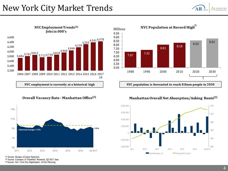3 Q3 2017 Highlights ▪ Portfolio occupancy increased from 85.5% in Q2 2017 to 87.1% in Q3 2017 ▪ NYCR continues to make progress on its leasing campaign at 9 Times Square, entering into one new office lease for 26,340 SF (comprised of 3 floors) and one new retail lease for 1,203 SF ▪ Terms for two of the three floors under the new office lease executed in Q3 2017 had not commenced by quarter - end and therefore not included in the total portfolio occupancy of 87.1% ▪ If terms for all three floors commenced during Q3 2017, occupancy at 9 Times square would have increased from 58.3% as of June 30, 2017 to 68.4% as of September 30, 2017 (1) ▪ Two lease renewals at other properties for 48,519 SF commenced during Q3 2017 ▪ NYCR continues to see strong leasing activity for additional office and retail space across the portfolio ▪ Published an updated NAV of $20.26 per share on October 26, 2017 (2) New York City REIT continued its strong leasing momentum with over 76,000 square feet of leasing activity in Q3 2017 (1) As of September 30, 2017, occupancy at 9 Times Square was 57.9% (2) Based on 31,029,865 shares outstanding as of June 30, 2017