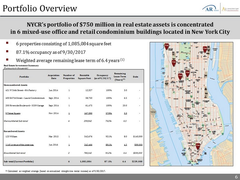 5 Key Initiatives (1) Based on total real estate investments at cost and total mortgage notes payable, net of deferred financing costs per 9/30/17 ba lance sheet ▪ NYCR’s management team is continuing to execute its strategy to: ▪ Strategically market vacancy to increase occupancy levels ▪ Maintain the portfolio’s overall quality and an efficient capital structure ▪ Position the Company for a sale or liquidity event ▪ Debt/cost ratio remains low at ~31% (1) providing room for additional leverage and potential portfolio growth ▪ Continue 9 Times Square office and retail leasing campaign ▪ Continue to market vacancy at 123 William and 1140 Avenue of the Americas ▪ Pursue selective acquisitions in New York City at attractive cap rates NYCR Continues to Execute its Strategy