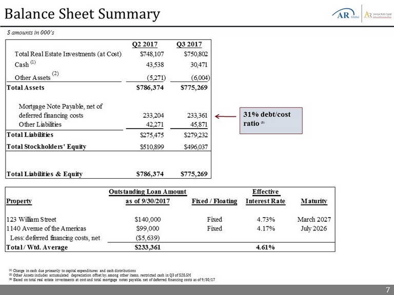6 Portfolio Overview (1) Calculated as weighted average (based on annualized straight - line rental income) as of 9/30/2017. ▪ 6 properties consisting of 1,085,084 square feet ▪ 87.1% occupancy as of 9/30/2017 ▪ Weighted average remaining lease term of 6.4 years (1) NYCR’s portfolio of $750 million in real estate assets is concentrated in 6 mixed - use office and retail condominium buildings located in New York City Real Estate Investment Summary ($ amounts in thousands) Portfolio Acquisition Date Number of Properties Rentable Square Feet Occupancy (as of 9/30/17) Remaining Lease Term (Years) (1) Debt Unencumbered Assets 421 W 54th Street – Hit Factory Jun. 2014 1 12,327 100% 3.0 - 400 E 67th Street – Laurel Condominium Sept. 2014 1 58,750 100% 6.5 - 200 Riverside Boulevard – ICON Garage Sept. 2014 1 61,475 100% 20.0 - 9 Times Square Nov. 2014 1 167,390 57.9% 5.3 - Unencumbered Sub-total 4 299,942 76.5% 6.5 - Encumbered Assets 123 William Mar. 2015 1 542,676 92.1% 8.0 $140,000 1140 Avenue of the Americas Jun. 2016 1 242,466 89.1% 4.5 $99,000 Encumbered Sub-total 2 785,142 91.2% 6.4 $239,000 Sub-total (Current Portfolio) 6 1,085,084 87.1% 6.4 $239,000