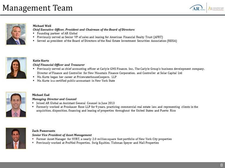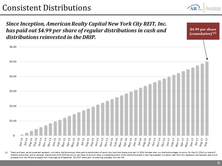 8 Management Team Katie Kurtz Chief Financial Officer and Treasurer ▪ Previously served as chief accounting officer at Carlyle GMS Finance, Inc., The Carlyle Group’s business development company, Director of Finance and Controller for New Mountain Finance Corporation, and Controller at Solar Capital Ltd ▪ Ms. Kurtz began her career at PricewaterhouseCoopers, LLP ▪ Ms. Kurtz is a certified public accountant in New York State Michael Weil Chief Executive Officer, President and Chairman of the Board of Directors ▪ Founding partner of AR Global ▪ Previously served as Senior VP of sales and leasing for American Financial Realty Trust (AFRT) ▪ Served as president of the Board of Directors of the Real Estate Investment Securities Association (REISA) Michael Ead Managing Director and Counsel ▪ Joined AR Global as Assistant General Counsel in June 2013 ▪ Formerly worked at Proskauer Rose LLP for 9 years, practicing commercial real estate law, and representing clients in the acquisition, disposition, financing and leasing of properties throughout the United States and Puerto Rico Zach Pomerantz Senior Vice President of Asset Management ▪ Former Asset Manager for NYRT, a nearly 2.0 million square foot portfolio of New York City properties ▪ Previously worked at ProMed Properties, Swig Equities, Tishman Speyer and Mall Properties