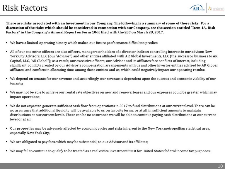 10 Risk Factors There are risks associated with an investment in our Company. The following is a summary of some of these risks. For a discussion of the risks which should be considered in connection with our Company, see the section entitled “Item 1A. Risk Factors” in the Company’s Annual Report on Form 10 - K filed with the SEC on March 28, 2017. ▪ We have a limited operating history which makes our future performance difficult to predict; ▪ All of our executive officers are also officers, managers or holders of a direct or indirect controlling interest in our advi sor , New York City Advisors, LLC (our "Advisor") and other entities affiliated with AR Global Investments, LLC (the successor business to AR Capital, LLC, "AR Global"); as a result, our executive officers, our Advisor and its affiliates face conflicts of interest, i ncl uding significant conflicts created by our Advisor’s compensation arrangements with us and other investor entities advised by AR Gl oba l affiliates, and conflicts in allocating time among these entities and us, which could negatively impact our operating results ; ▪ We depend on tenants for our revenue and, accordingly, our revenue is dependent upon the success and economic viability of ou r tenants; ▪ We may not be able to achieve our rental rate objectives on new and renewal leases and our expenses could be greater, which m ay impact operations; ▪ We do not expect to generate sufficient cash flow from operations in 2017 to fund distributions at our current level. There c an be no assurance that additional liquidity will be available to us on favorite terms, or at all, in sufficient amounts to maintai n distributions at our current levels. There can be no assurance we will be able to continue paying cash distributions at our c urr ent level or at all; ▪ Our properties may be adversely affected by economic cycles and risks inherent to the New York metropolitan statistical area, especially New York City; ▪ We are obligated to pay fees, which may be substantial, to our Advisor and its affiliates; ▪ We may fail to continue to qualify to be treated as a real estate investment trust for United States federal income tax purpo ses ;