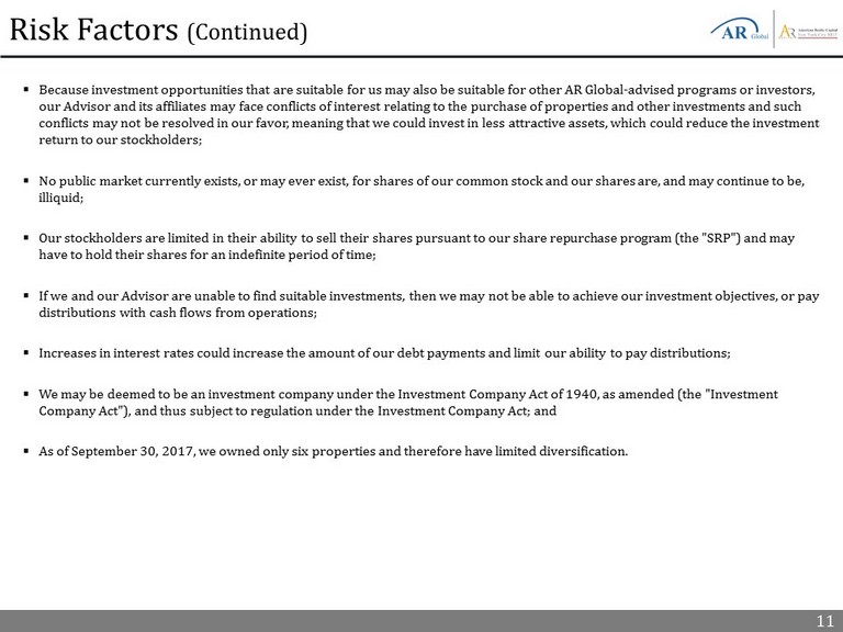 11 Risk Factors (Continued) ▪ Because investment opportunities that are suitable for us may also be suitable for other AR Global - advised programs or investors , our Advisor and its affiliates may face conflicts of interest relating to the purchase of properties and other investments an d s uch conflicts may not be resolved in our favor, meaning that we could invest in less attractive assets, which could reduce the in ves tment return to our stockholders; ▪ No public market currently exists, or may ever exist, for shares of our common stock and our shares are, and may continue to be, illiquid; ▪ Our stockholders are limited in their ability to sell their shares pursuant to our share repurchase program (the "SRP") and m ay have to hold their shares for an indefinite period of time; ▪ If we and our Advisor are unable to find suitable investments, then we may not be able to achieve our investment objectives, or pay distributions with cash flows from operations; ▪ Increases in interest rates could increase the amount of our debt payments and limit our ability to pay distributions; ▪ We may be deemed to be an investment company under the Investment Company Act of 1940, as amended (the "Investment Company Act"), and thus subject to regulation under the Investment Company Act; and ▪ As of September 30, 2017, we owned only six properties and therefore have limited diversification.